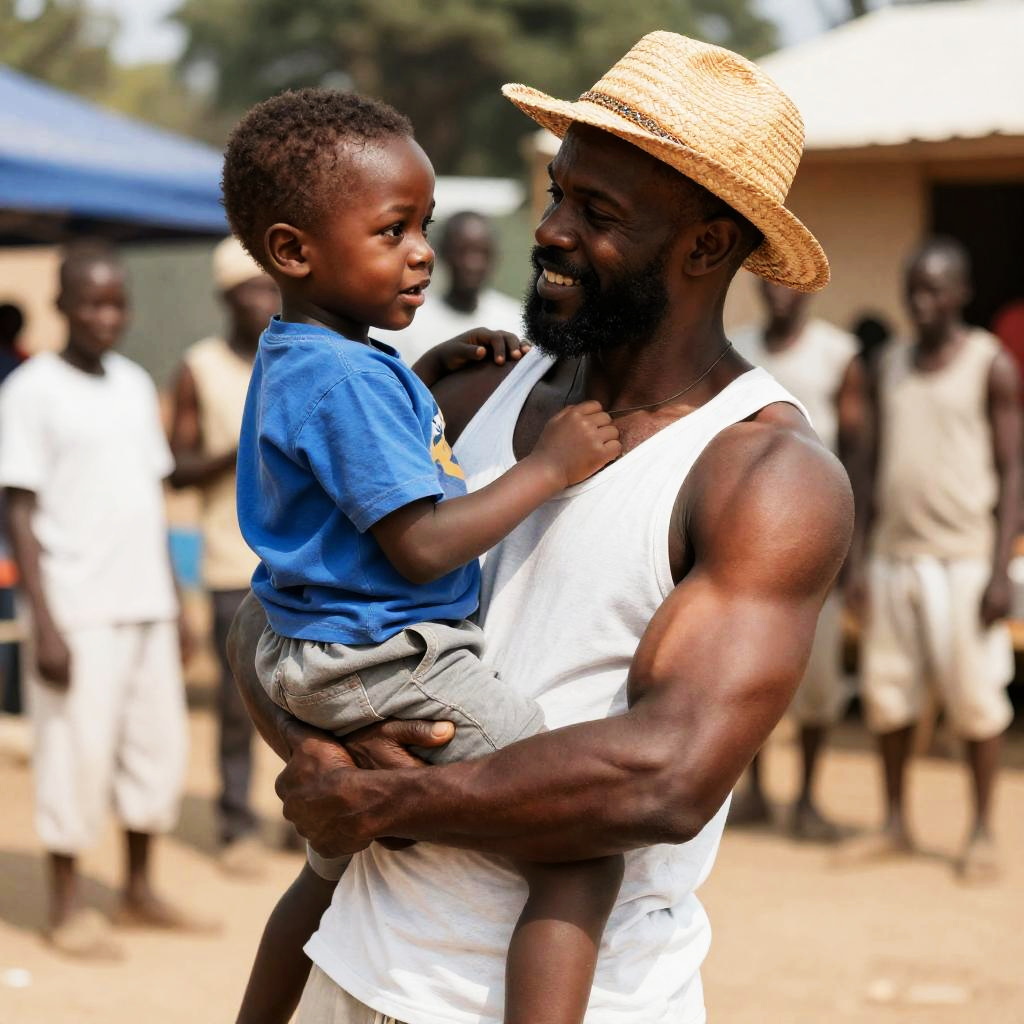 African-American man with a beard, wearing a white shirt and blue jeans, carrying a small, light-skinned girl in pink clothes through dense green jungle foliage. He looks determined. She is tucked against his chest, eyes closed. Jungle leaves fill the background. Man's pants are partially pulled down, revealing black boots. He has a black utility belt around his waist.