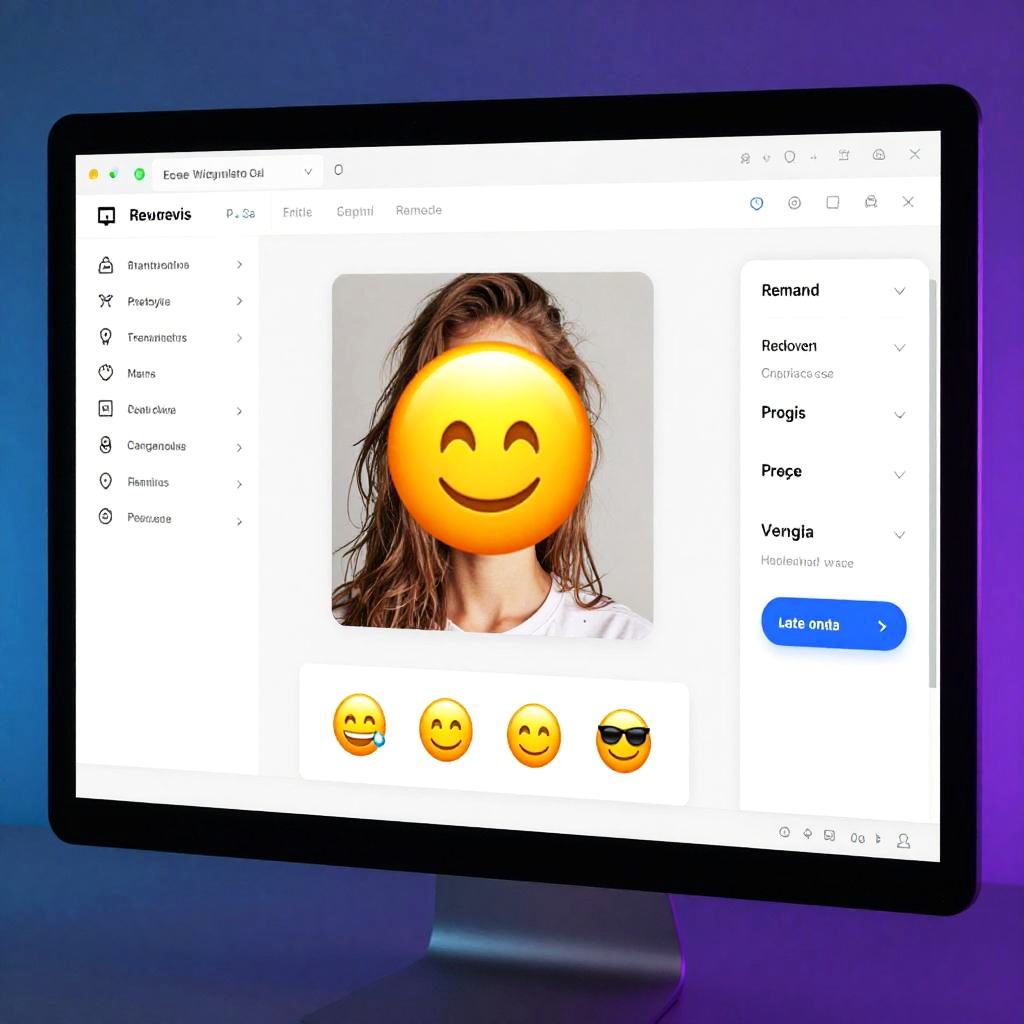 Remove emoji from picture online free, focus on a vibrant computer screen displaying an easy-to-use photo editing software, highlighting the process of erasing emojis smoothly from images, with creative icons and responsive web layout, futuristic tech vibe.