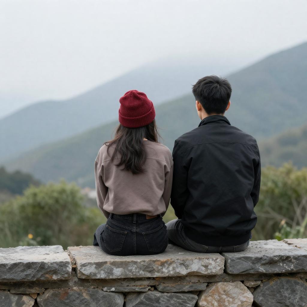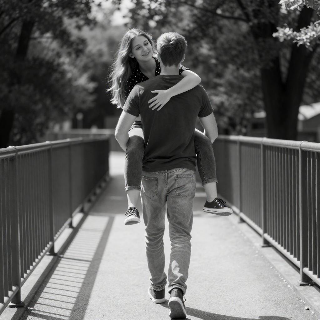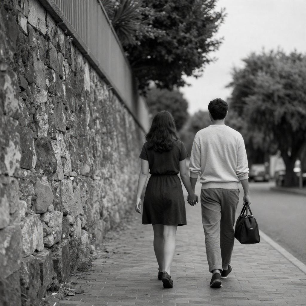 Black-and-white photograph of a man and woman walking along a narrow, cobblestone path beside a weathered stone wall. The woman, in a dark dress, and the man, in a light sweater and pants, hold hands and carry a bag. Trees and foliage are in the background.