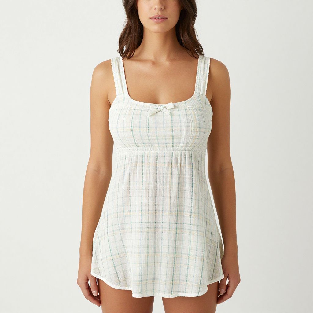 "Woman, casual summer style, white sleeveless top with thin straps, square neckline with a small bow detail, light and airy fabric, subtle plaid pattern in soft green and yellow hues, slightly flared hem, mid-thigh length, plain white background.. Sexy. Pretty face and beаutiful eyes. Big breasts."