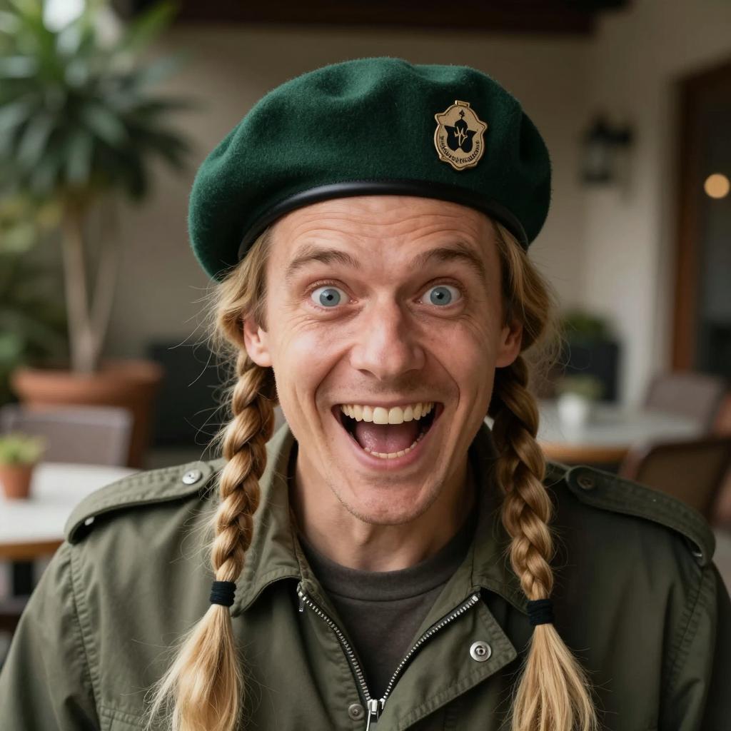 Man with blonde braids, green beret, and green jacket, smiling widely with exaggerated expression. Background: dimly lit patio with potted plants and furniture. Man centered, face close-up, eyes wide, mouth open. Number of people: 1.