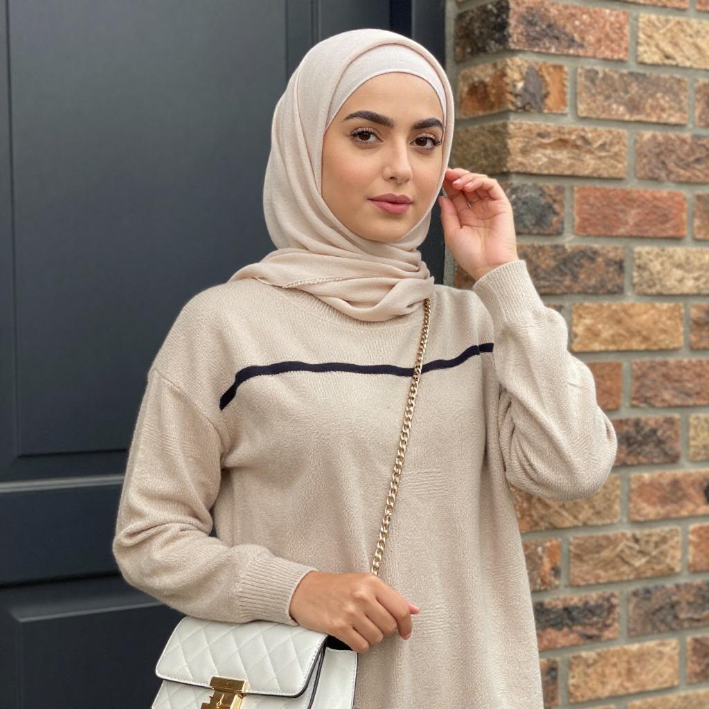 Photograph of a young woman with light skin and brown eyes, wearing a beige hijab, white long-sleeve top, and high-waisted beige pants. She holds a brown handbag and stands in a modern living room with gray curtains, white walls, and a marble floor.