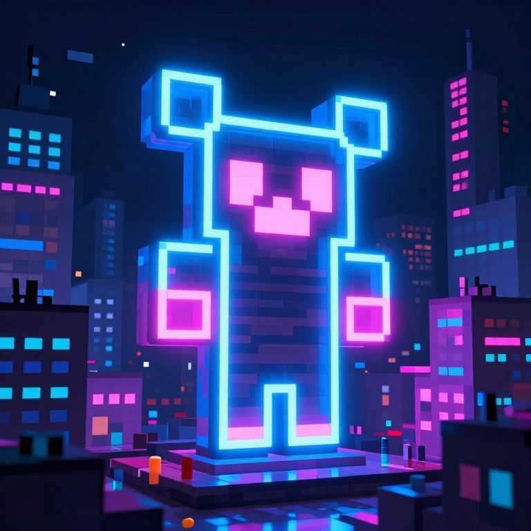 Neon sign Minecraft style glowing brightly in a dark pixelated cityscape, vibrant blue and pink neon hues illuminating blocky buildings, digital futuristic ambiance, detailed pixel art, nighttime scene with a sense of adventure and creativity.