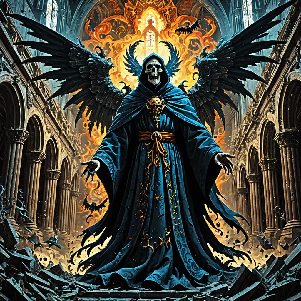 Dark horror cartoon masterpiece in post-apocalyptic steampunk, decayed automaton with flickering internal flames surveying ruins with raven corpses, rusted industrial wasteland under blood-red skies, vivid colors, infinite fractals.
