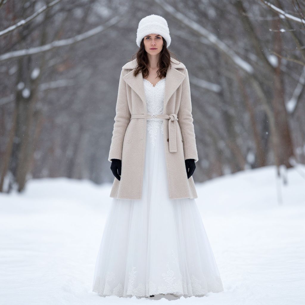 "Winter Wedding Outfit Over Costume, woman in a coat and hat standing in the snow"