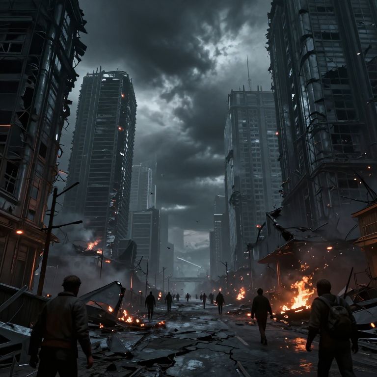 Apocolyps scene depicting a dystopian city in ruins, dark stormy skies overhead, twisted metal and crumbling skyscrapers, eerie glowing embers scattered across cracked streets, survivors wandering amidst chaos, cinematic lighting, hyper-detailed, post-apocalyptic atmosphere