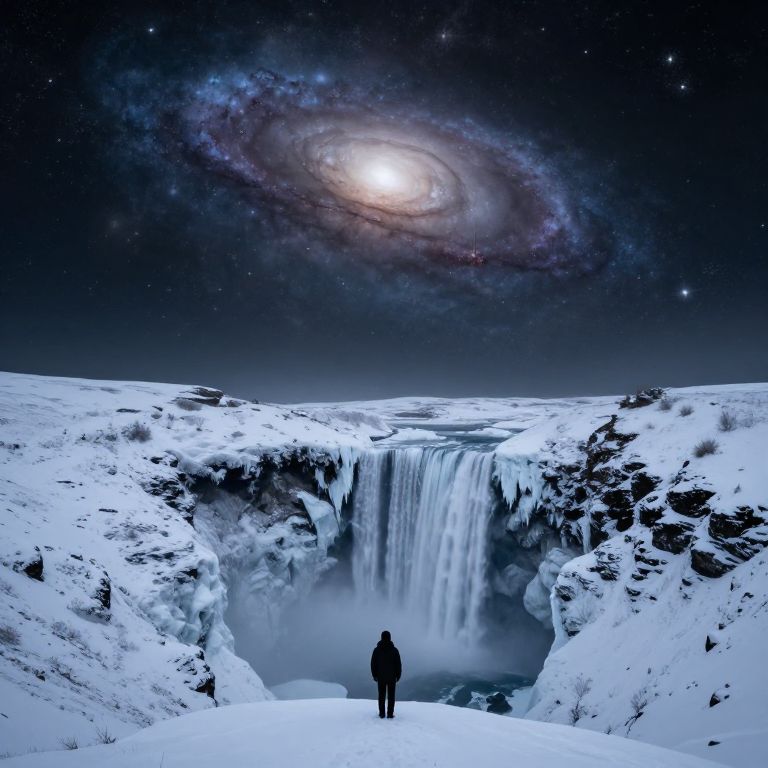 In the surrealistic style of dreamlike landscapes, depict an immense, barren tundra blanketed in snow stretching endlessly under a dark and haunting sky filled with swirling galaxies and nebulae. From an unconventional perspective, observe a solitary figure standing atop a frozen waterfall cascading into the starry void, their silhouette barely discernible in the foreground. This enigmatic scene juxtaposes the vastness of the cosmos with the solitary grandeur of humanity, evoking a spectrum of emotions from awe to solitude while challenging our perception and imagination.