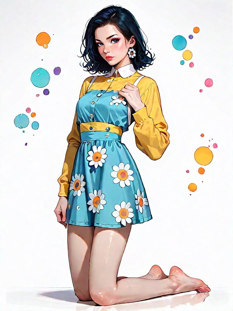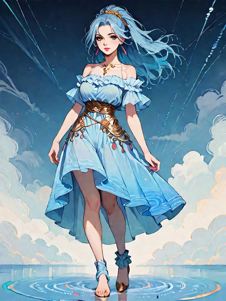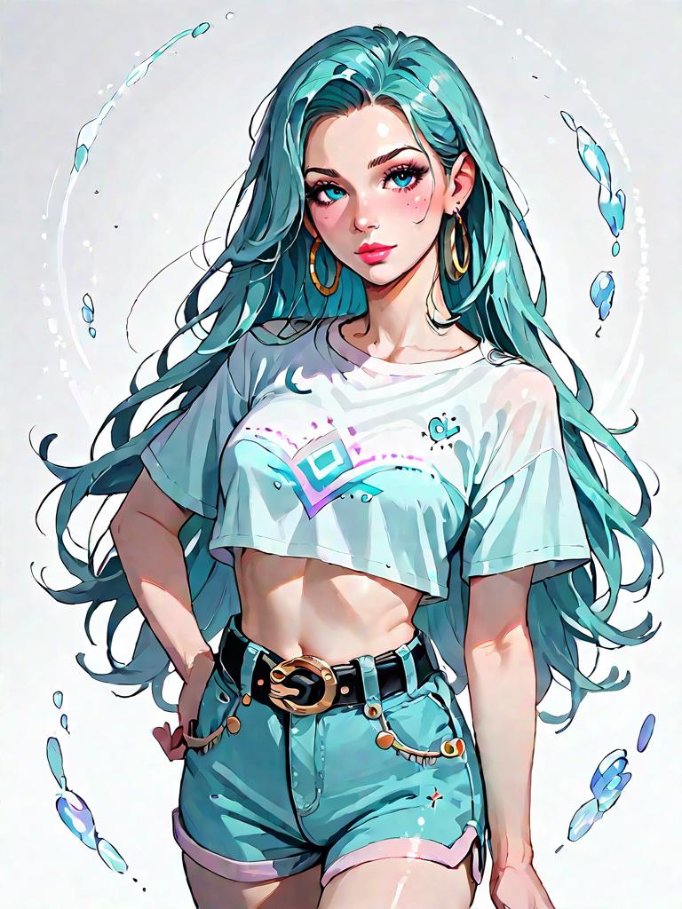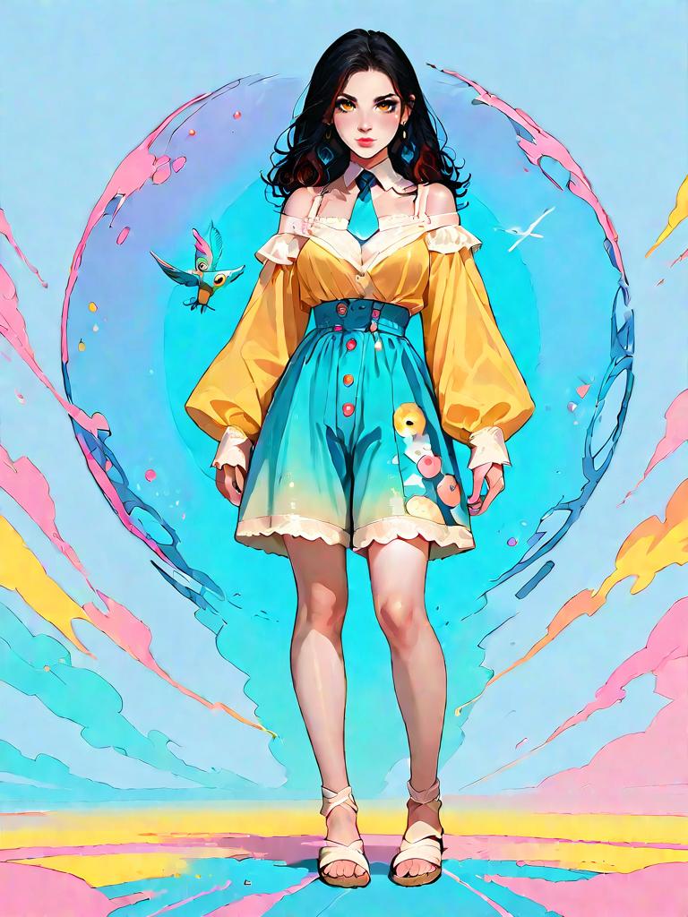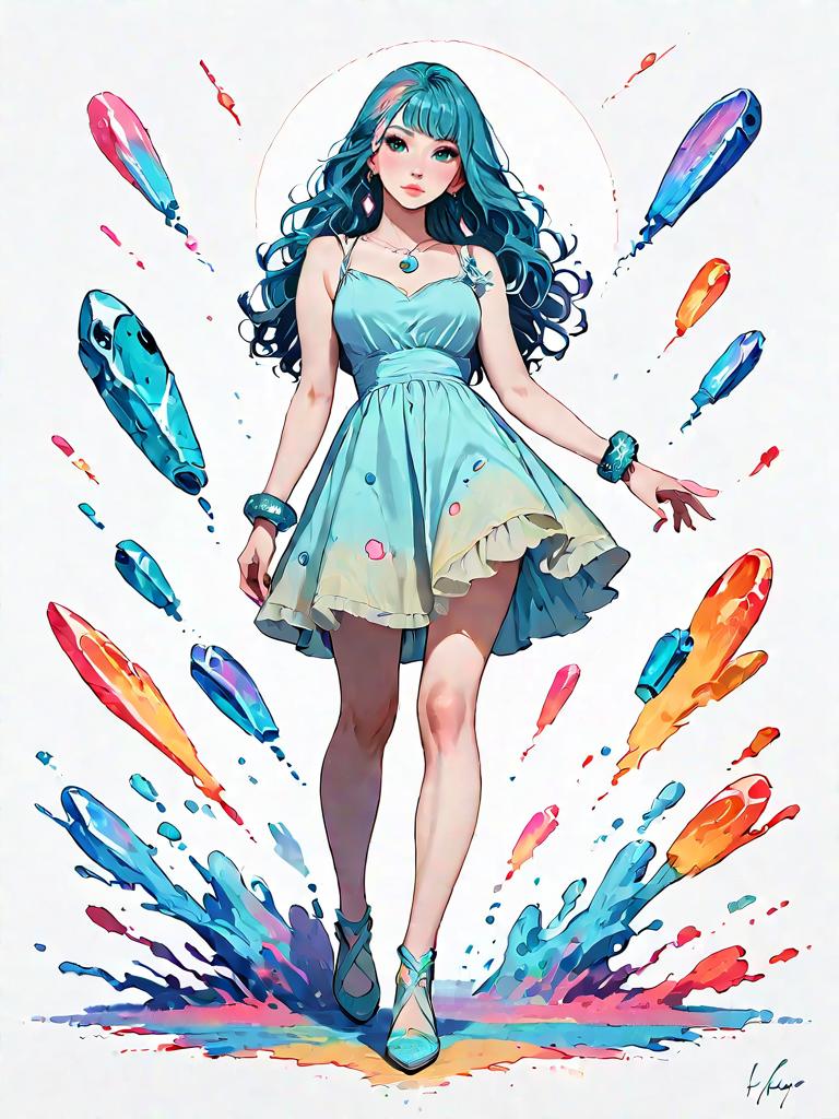 Digital illustration of a full-body shot of a woman with wavy blue hair wearing a light turquoise mini dress with spaghetti straps and a scoop neckline. She accessorizes with a turquoise stone pendant necklace and chunky turquoise bracelets. The woman is surrounded by colorful, dynamic splashes of blue, orange, and red paint-like elements, creating a vibrant and artistic effect against a white background.