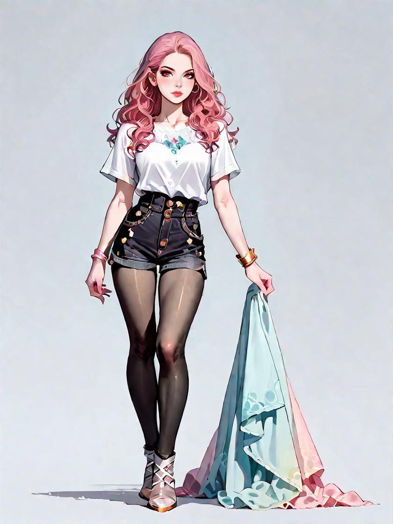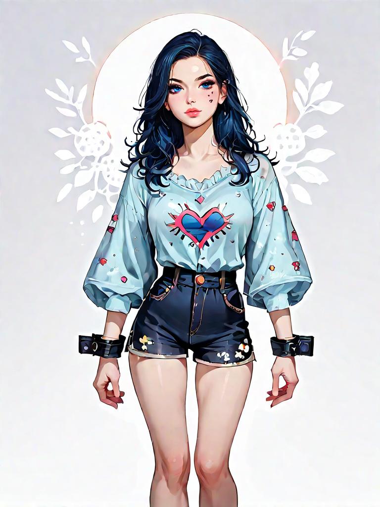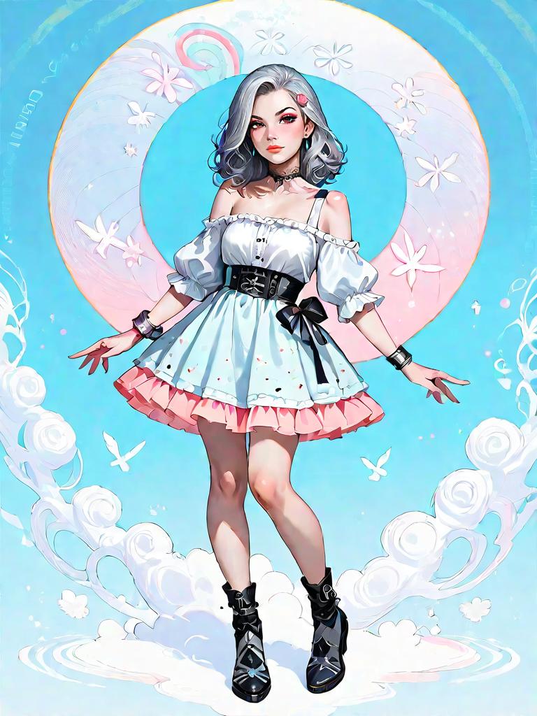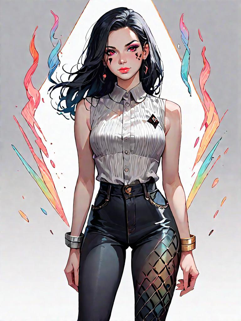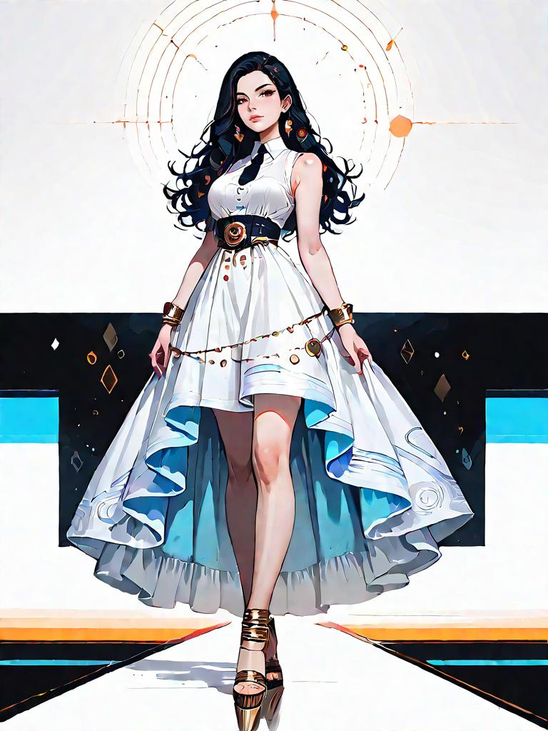 Digital illustration of a full-body shot of a woman with wavy blue hair wearing a light turquoise mini dress with spaghetti straps and a scoop neckline. She accessorizes with a turquoise stone pendant necklace and chunky turquoise bracelets. The woman is surrounded by colorful, dynamic splashes of blue, orange, and red paint-like elements, creating a vibrant and artistic effect against a white background.