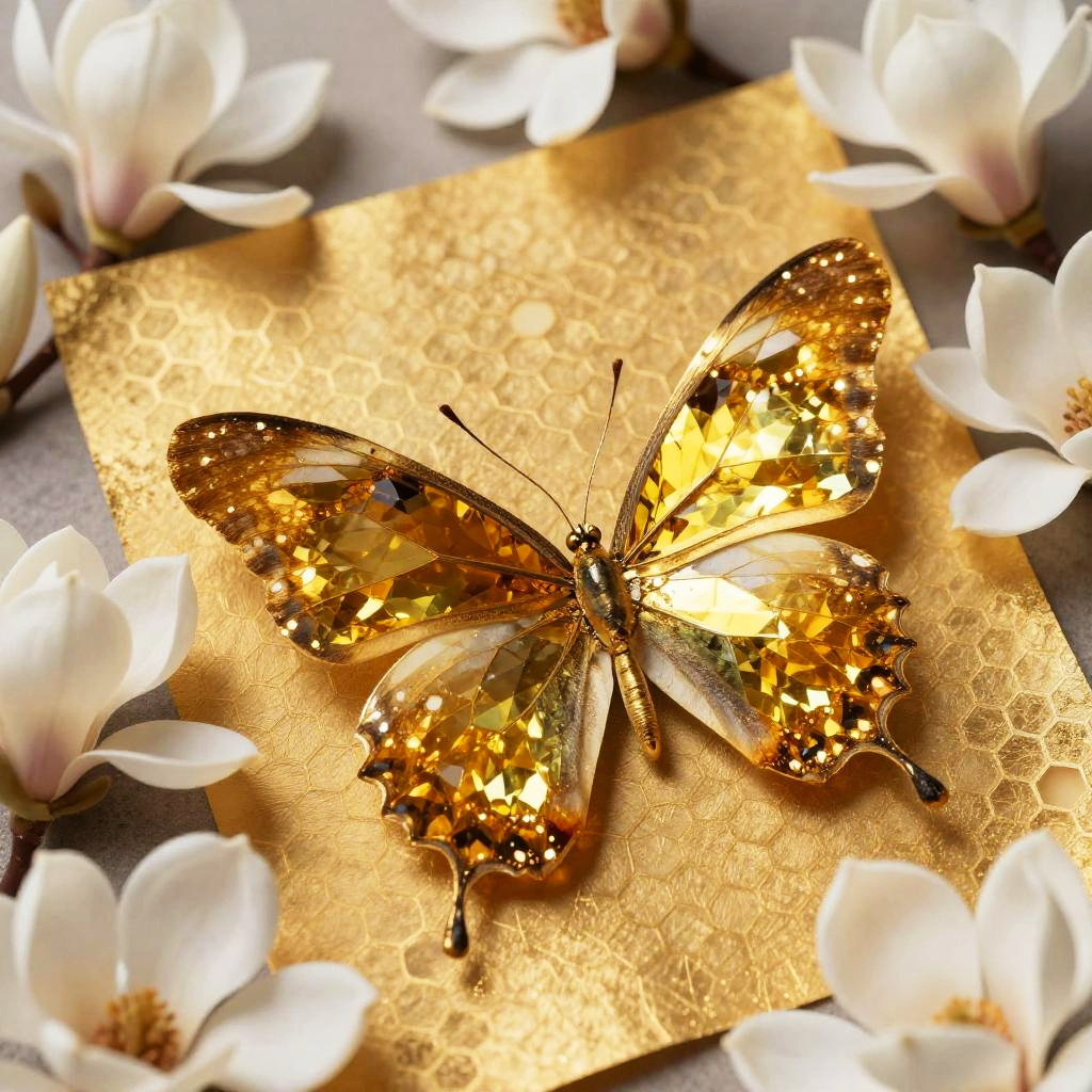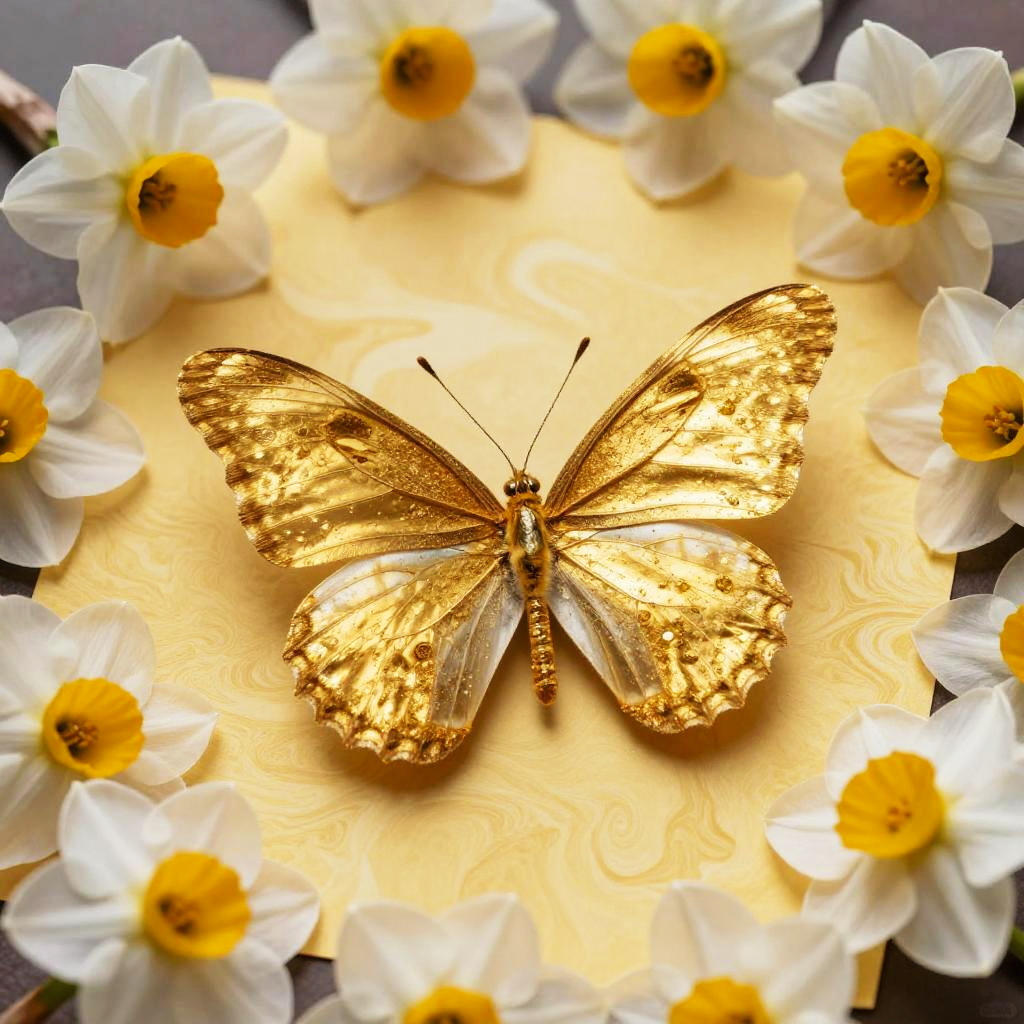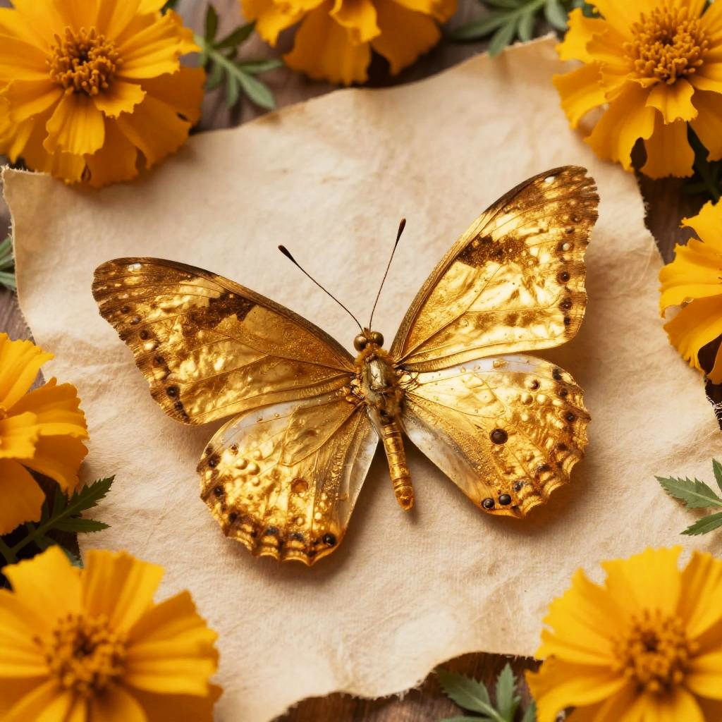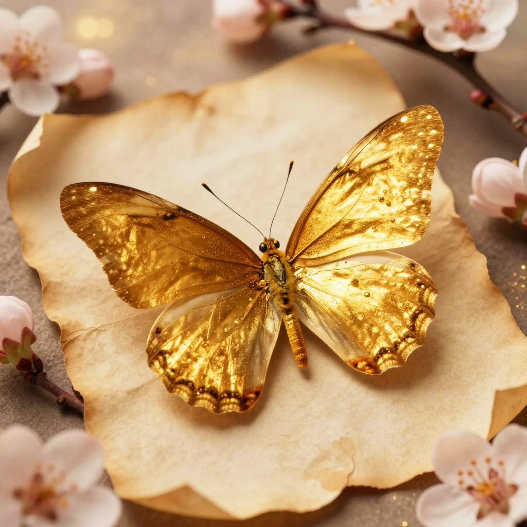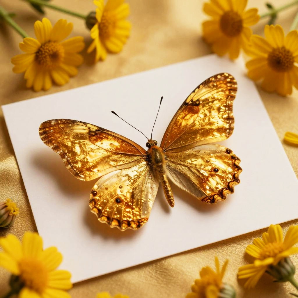A realistic 10k image of a beautifully detailed golden majestic butterfly gently resting on a smooth lemon chiffon cotton paper symbolizing personal growth and self-love. The background is filled with soft creamy gardenias representing the blossoming of one's self-worth. Dimensions: 6 x 9 inches