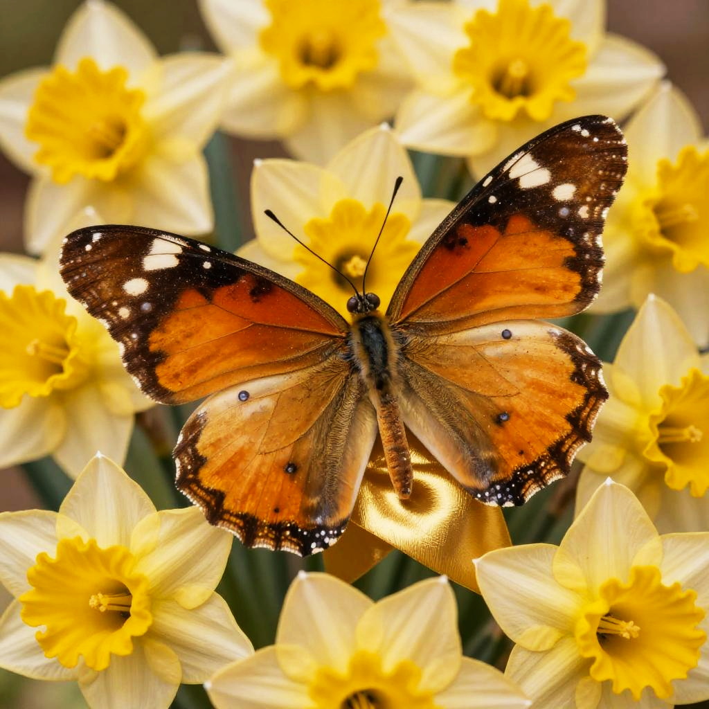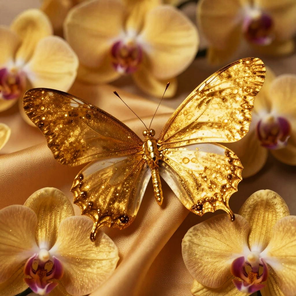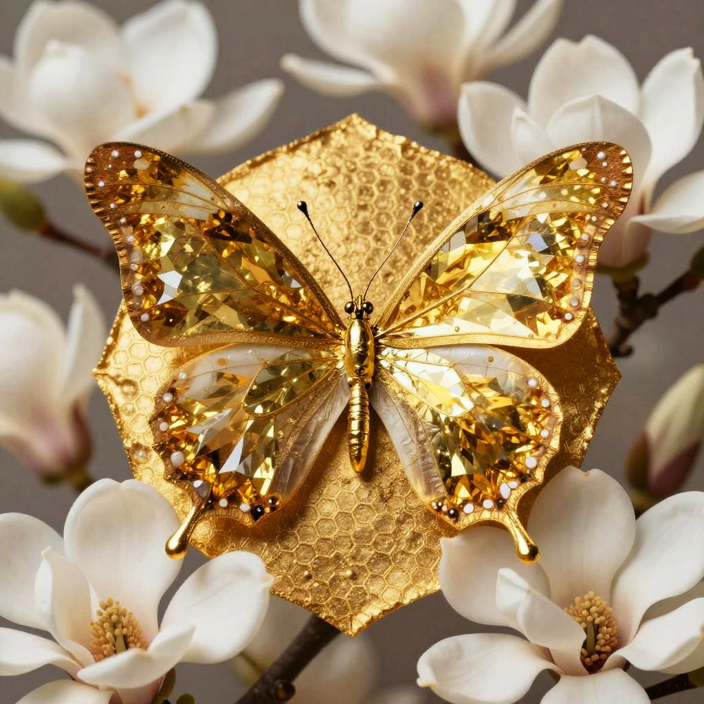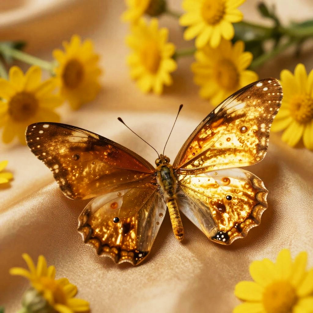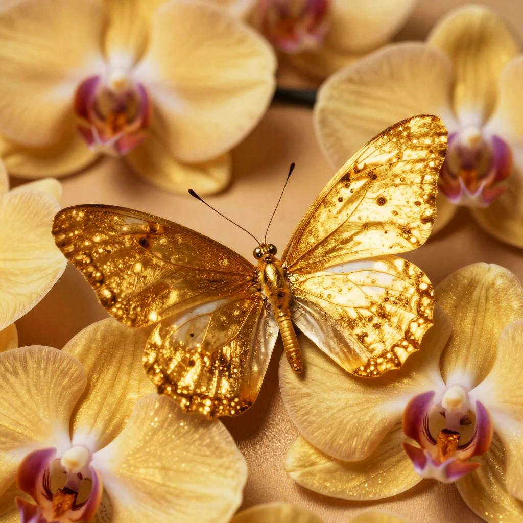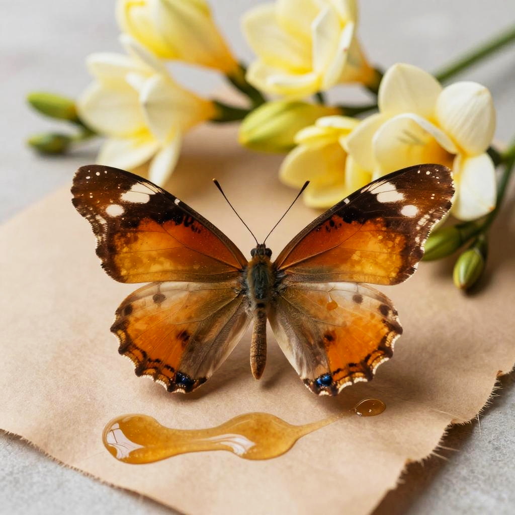 A realistic 10k image of a beautifully detailed golden majestic butterfly gently resting on a smooth lemon chiffon cotton paper symbolizing personal growth and self-love. The background is filled with soft creamy gardenias representing the blossoming of one's self-worth. Dimensions: 6 x 9 inches