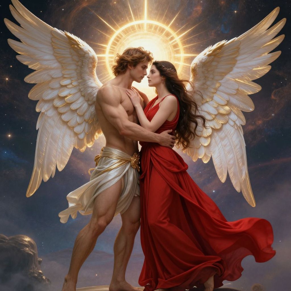 An ethereal embrace between a muscular angel and a woman draped in flowing red fabric, set against a celestial backdrop with a radiant golden halo, defying the boundaries of mortal and divine realms.