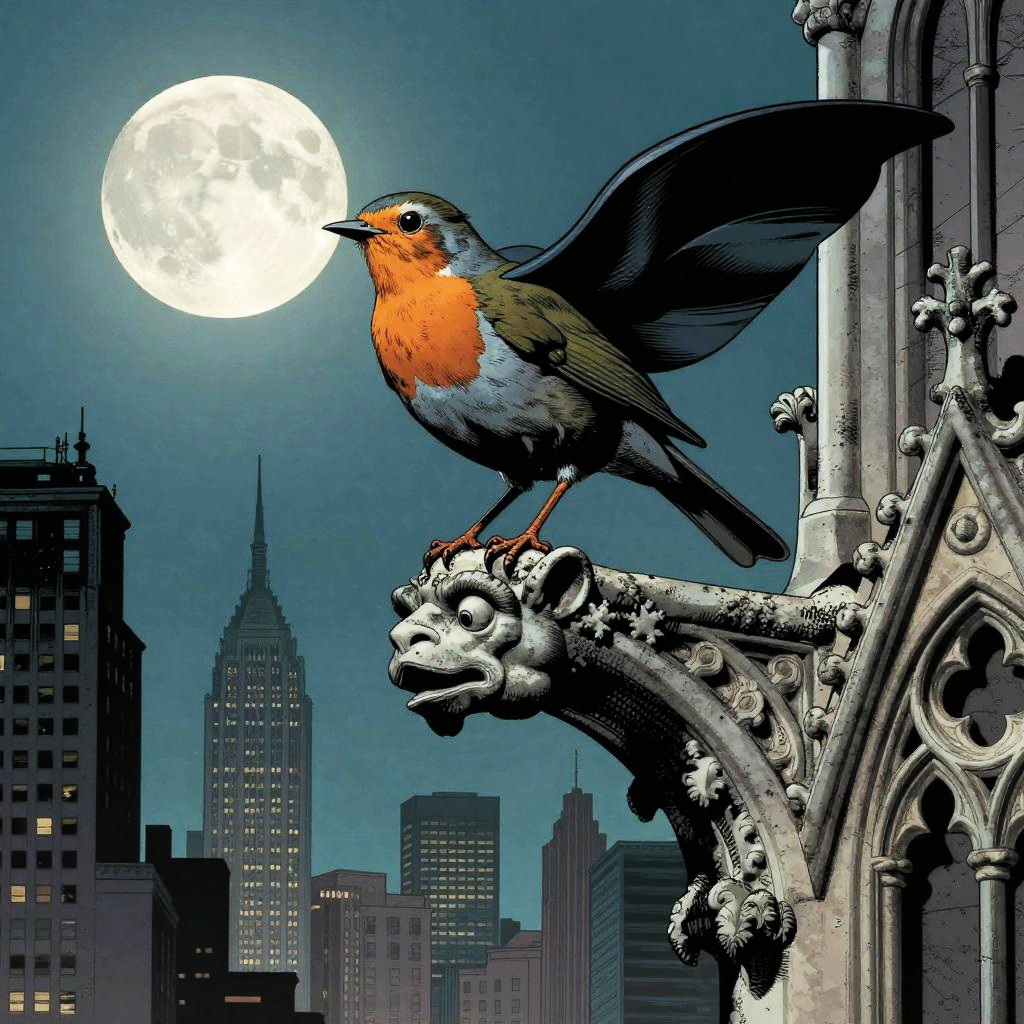 Digital artwork of a robin with vibrant orange breast perched on a Gothic architectural ledge, moonlit night, city skyline with skyscrapers.