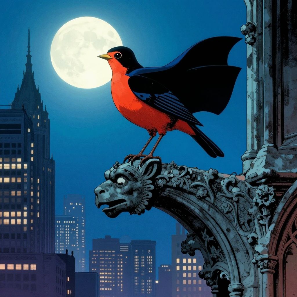 Female robin DC perched on gothic gargoyle statue at night, moonlit sky behind, stylized cape flowing, intricate cityscape with towering skyscrapers, classic DC comic illustration style