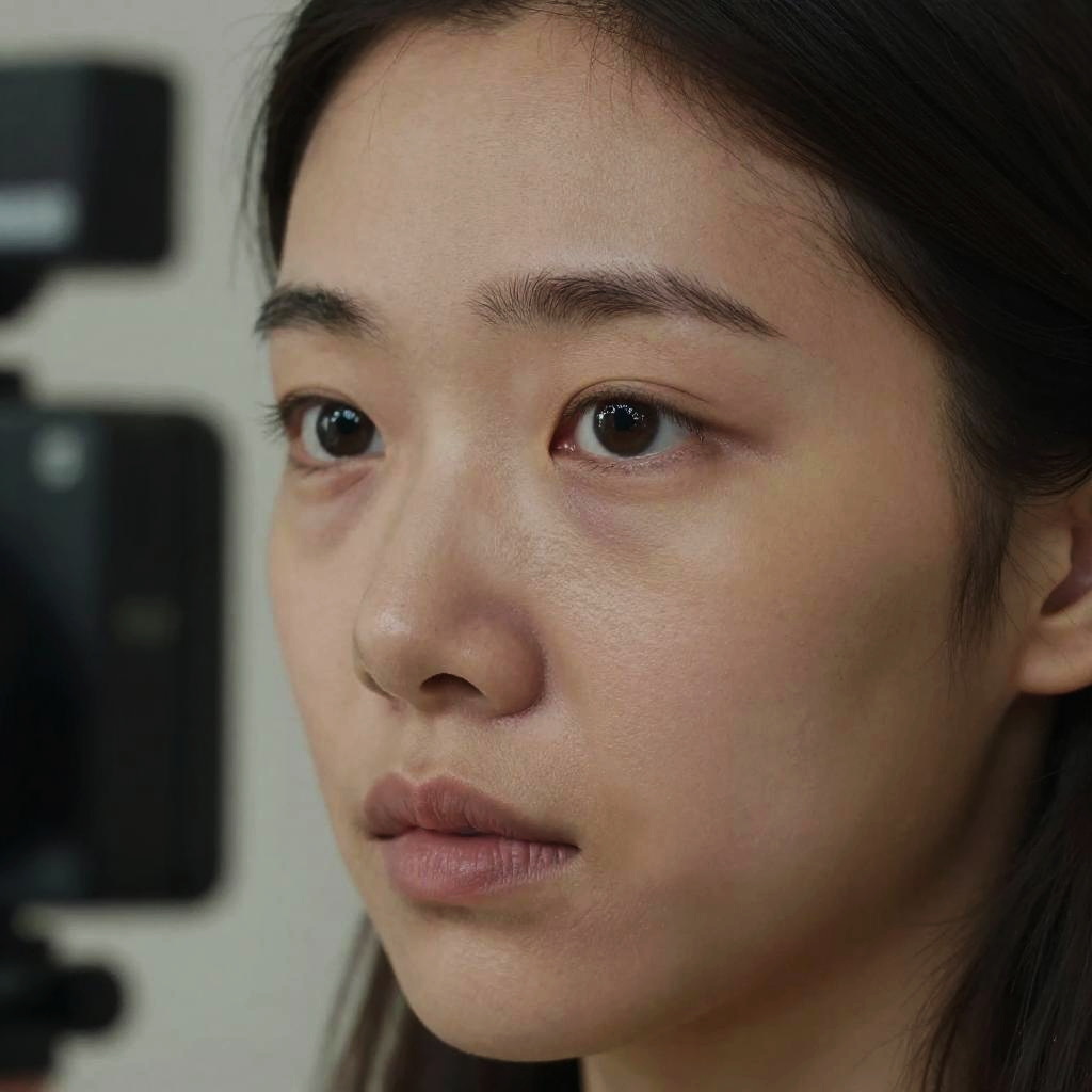 Photograph of a young Asian woman with medium-length, straight black hair, and fair skin. Her face is close-up, showing her large, dark brown eyes with a slight, thoughtful expression. Her eyebrows are thin and slightly arched, and her lips are closed with a subtle, neutral pink hue. The background is blurred but features a black camera or equipment on the left side. The lighting is soft, highlighting her smooth complexion and natural features. The overall mood is serious and contemplative.