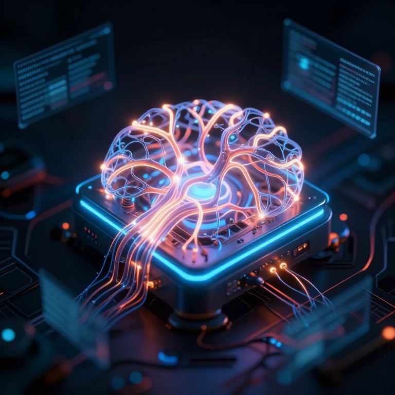 Neon-lit, glowing brain circuitry on a blue-edged, futuristic motherboard with wires, surrounded by dark screens displaying code in a sci-fi