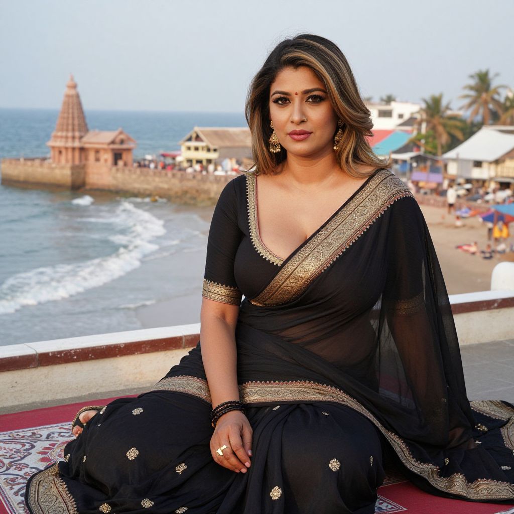 Photograph of a beautiful Indian woman with medium skin tone, wearing a black saree with gold embroidery, sitting on a beachfront terrace, ocean and