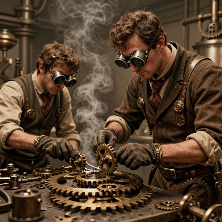 Photograph of two steampunk-style male engineers in a dimly lit industrial workshop. Both have curly brown hair, wear goggles, brown vests over beige shirts, and black gloves. They are working on a large, intricate gear assembly with metal cogs and bolts, surrounded by various mechanical parts. One man is in the foreground, focused on a gear, with a wisp of smoke rising from his tools, while the other man is in the background, also working. The background is filled with pipes and machinery, adding to the industrial atmosphere. The image has a rich, warm color palette with brown, beige, and metallic tones.