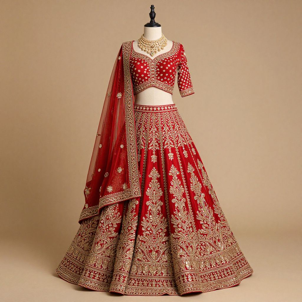 Photograph of a traditional Indian bridal lehenga on a mannequin. The ensemble features a red and gold embroidered lehenga with intricate floral and paisley patterns, a matching red dupatta with gold embellishments, and a red and gold cropped choli with a plunging neckline. The mannequin also wears a large, elaborate gold necklace. The background is a plain, light beige, highlighting the rich colors and detailed embroidery of the outfit. The fabric appears to be silk, with a smooth and slightly shiny texture. The overall style is elegant and traditional, showcasing intricate craftsmanship.