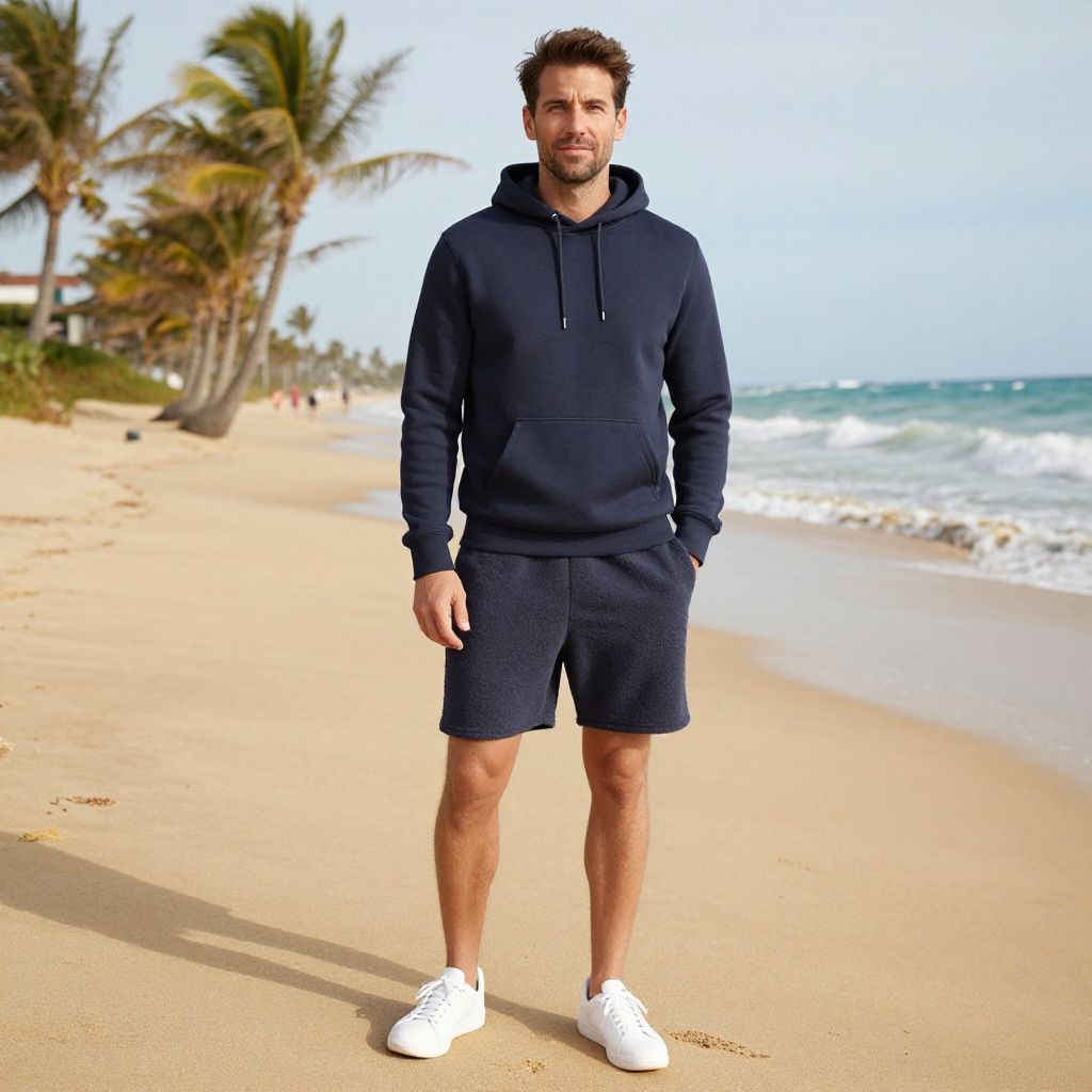 Photograph of a bearded man with short brown hair, wearing a navy hoodie, dark shorts, and white sneakers, standing on a sunny beach with