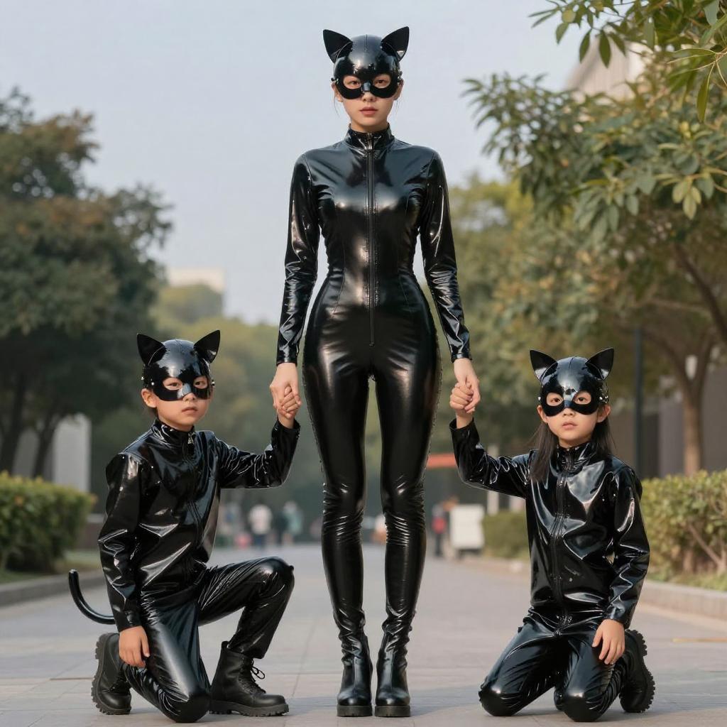 Photograph of a woman and two children in black, glossy, latex cat costumes with cat ears and masks. The woman stands tall, holding the hands of the two children, who are kneeling in front of her. They are outdoors, with blurred trees and greenery in the background, under bright, blue lighting.
