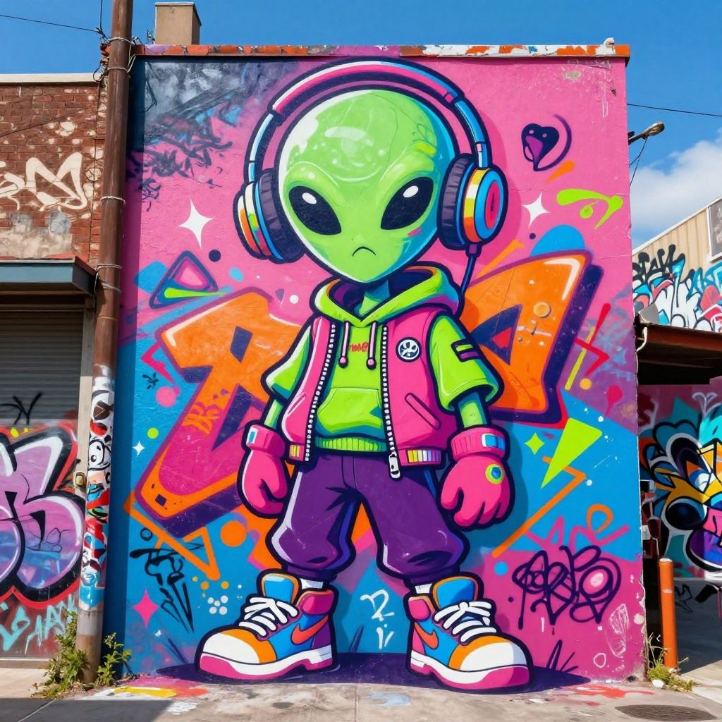 Vibrant and dynamic cartoon graffiti art featuring a funky alien character with bright neon colors including pink, green, blue, and orange. The alien wears a streetwear-inspired outfit with gloves, sneakers, and headphones, standing confidently in an urban alleyway covered in colorful street art and graffiti murals. The scene combines bold, playful design elements with a high-energy street culture aesthetic under a clear blue sky.