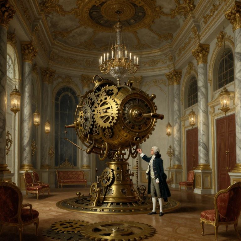 A digital illustration depicts a grand, opulent room with ornate, classical architecture. A white-haired, elderly man in 18th-century attire—black coat, white ruffled shirt, and knee-length breeches—stands to the right, touching a large, intricate brass mechanical clockwork device with gears and cogs. The device is centered on a circular brass platform. The room features high ceilings with elaborate gold detailing, arched windows, and chandeliers. Red velvet armchairs and wooden doors are placed symmetrically around the room. Warm, yellow lighting from wall sconces adds a vintage ambiance. The floor is a polished, checkered marble.