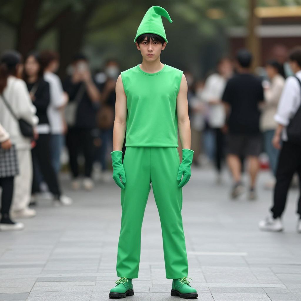 Photograph of a young Asian man standing in a busy urban street. He is dressed in a bright green outfit consisting of a sleeveless top, pants, gloves, and shoes. He also wears a green, pointed hat with a single tuft at the top. His expression is neutral, and he stands with his arms at his sides. The background is blurred, showing a crowd of people in various outfits, with trees and buildings partially visible. The street has a gray tiled pavement. The overall style is whimsical and playful, reminiscent of a costume or cosplay.