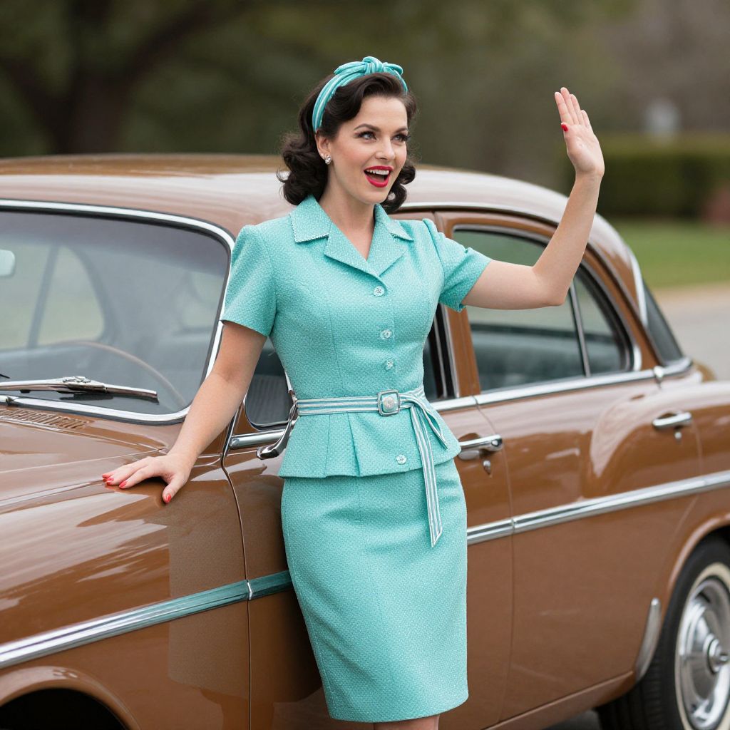 Elegantly dressed woman in a vintage turquoise outfit leaning against a classic brown 1950s car, waving cheerfully with her left hand while resting her right hand on the vehicle's door.