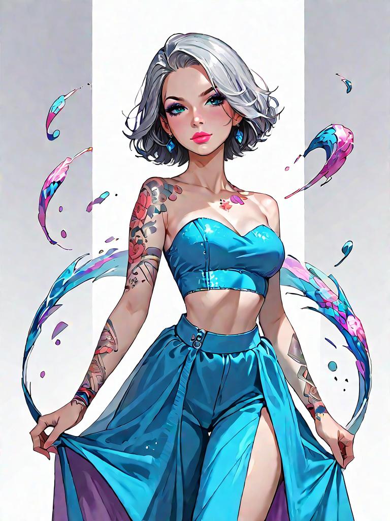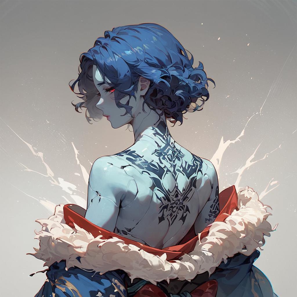 Score_9, score_8_up, source_anime, 1girl, cowboy shot, wavy hair, cracked skin, blue skin, colored skin, seductive smile, extra faces, dragon tattoo, back tattoo, kimono, off shoulder, doll joints