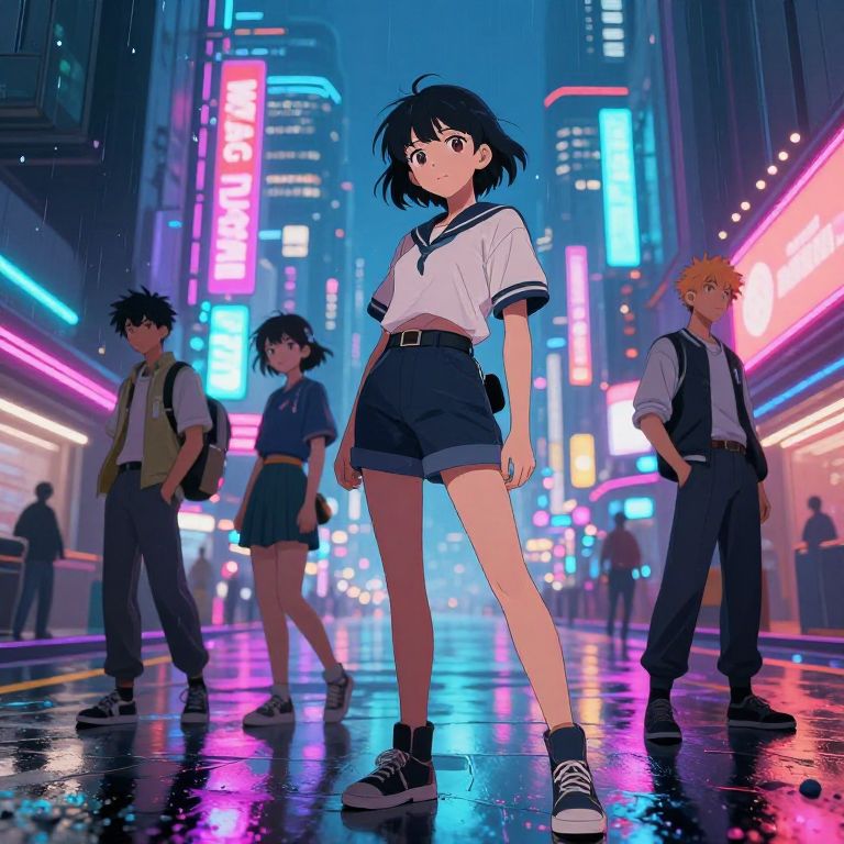 Anime art ai art generator creating vibrant futuristic cityscape, neon lights reflecting on rain-soaked streets, detailed characters with stylized expressions, dynamic poses, combining traditional anime aesthetic with AI-generated intricate textures, vivid color palette