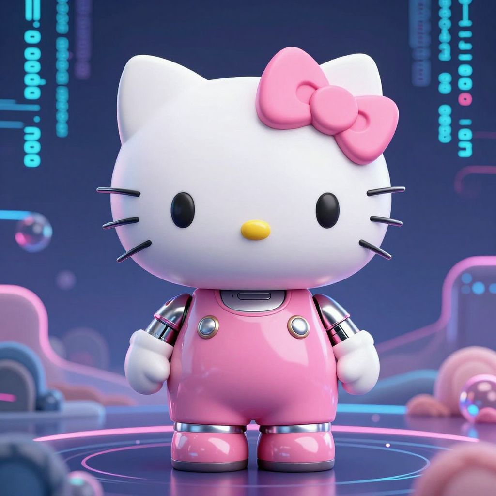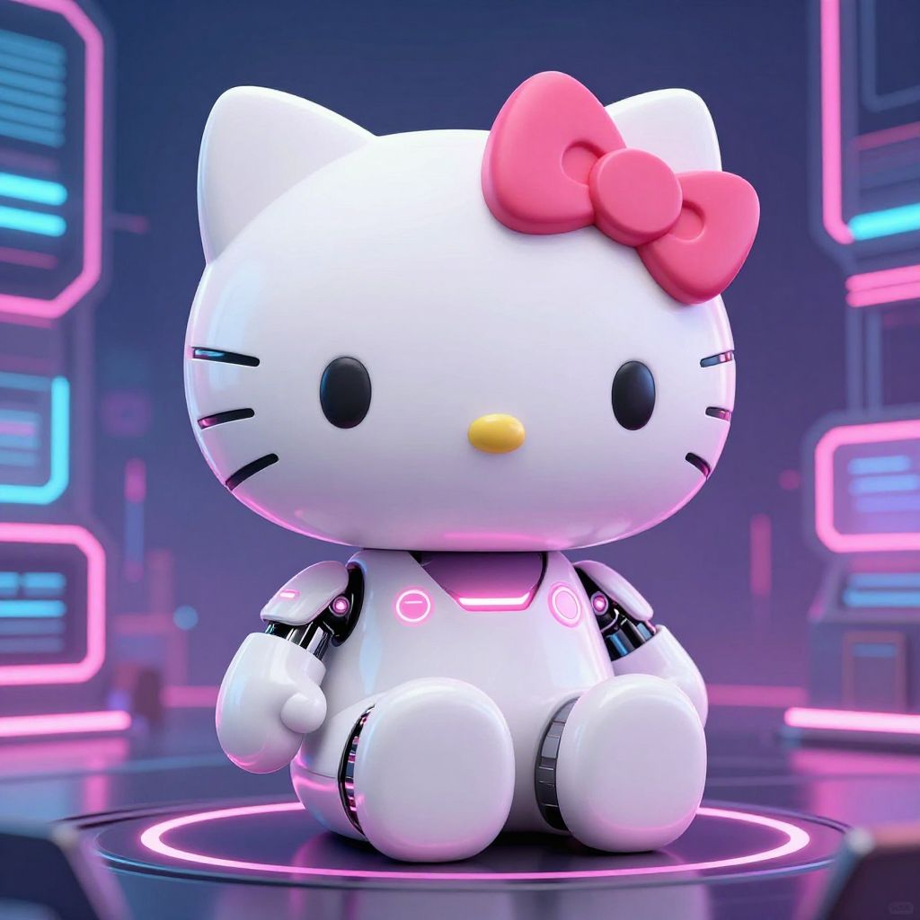 Hello Kitty AI generator concept art, futuristic kawaii robot cat with soft pastel tones, digital circuit patterns blending with cute cartoon features, neon pink and white palette, gentle glowing eyes, surrounded by holographic cherry blossoms