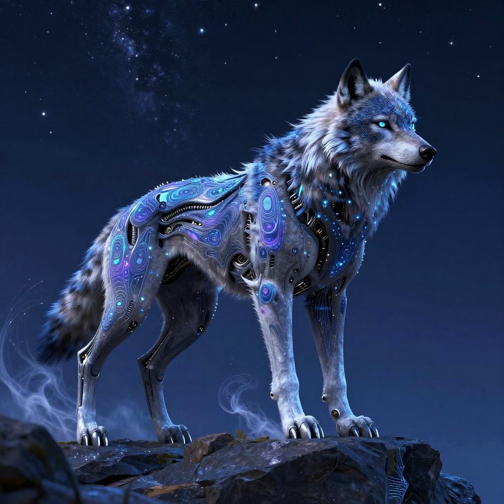 Majestic cybernetic wolf standing on a rocky outcrop against a starry night sky, fractal patterns on its armor-like coat, blue and purple LED highlights, digital mist swirling around its feet