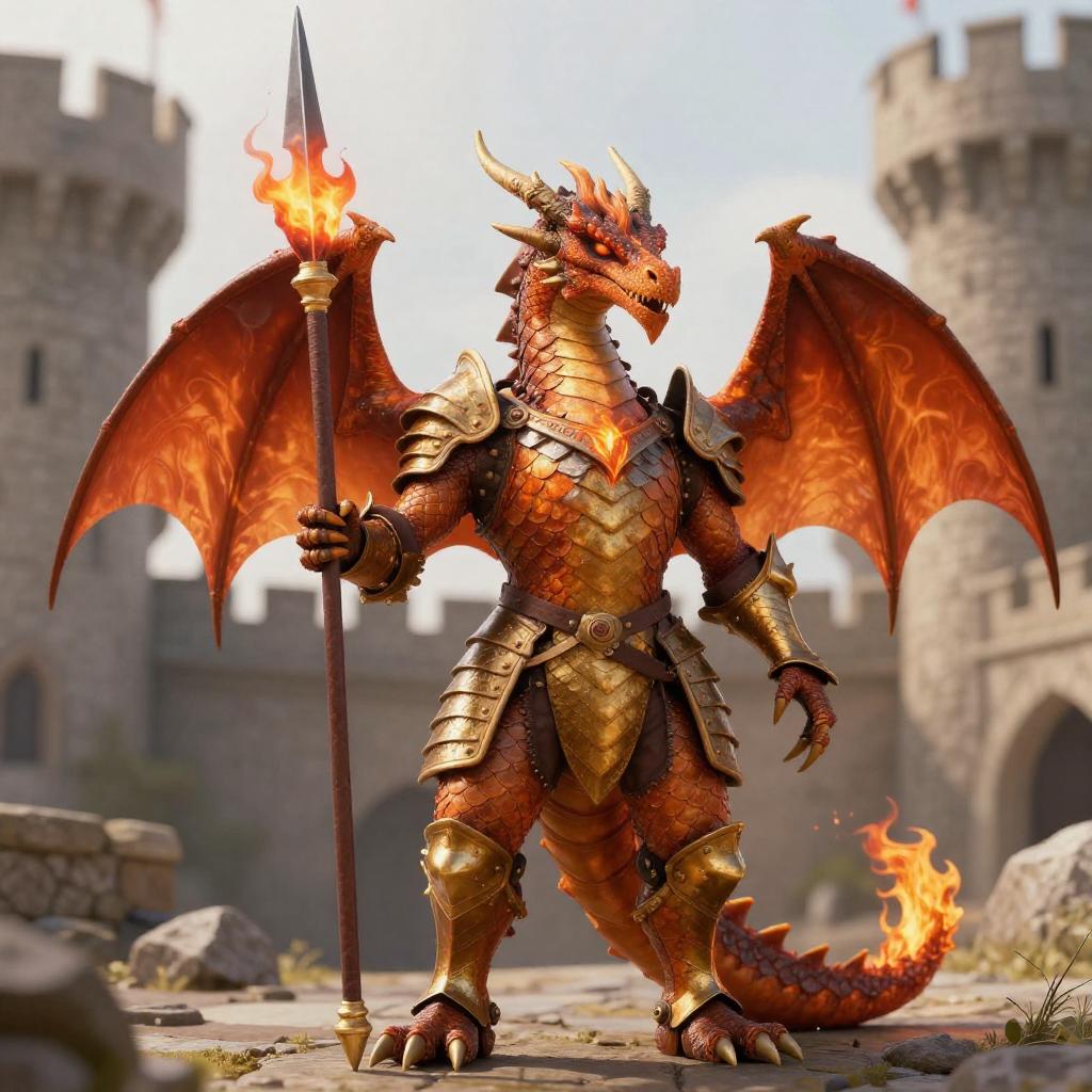 A detailed, colorful figurine of a fantastical dragon warrior standing on a tiled platform. The dragon features vibrant blue scales with multicolored accents, including orange, green, and yellow. It has large, red and blue wings, gold horns, and wears ornate green and gold armor. The figure holds a golden trident, enhancing its warrior appearance, set against a clear, light blue background.