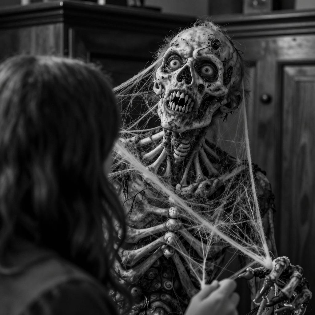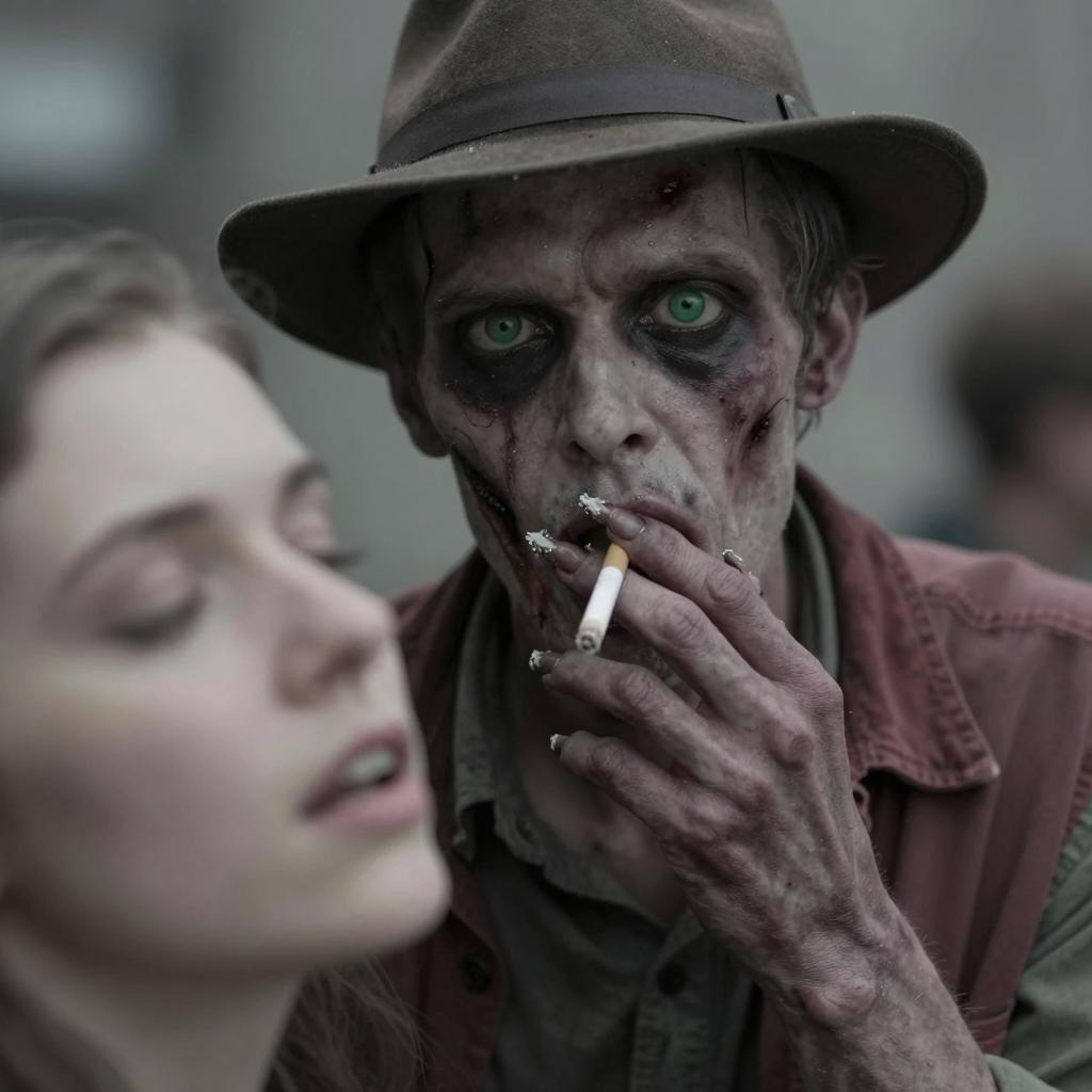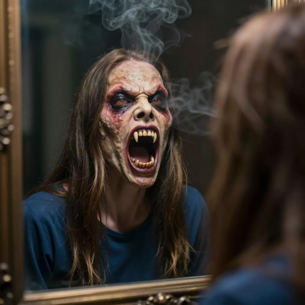 Close-up image featuring a Caucasian man wearing glasses with an expression of intense fear and mouth open. Next to him is a grotesque, partially decomposed humanoid figure with exposed teeth, bloody, dripping flesh, and a gaping mouth. The background is a deep red, enhancing the horror atmosphere. The creature's skin appears rough, wet, and disturbing, evoking a strong sense of terror.