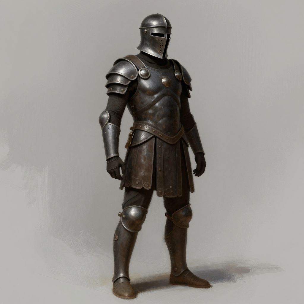 Implant Sci - fi roman legionary warrior in simple armor, full body view, character concept art, painterly style, dark,