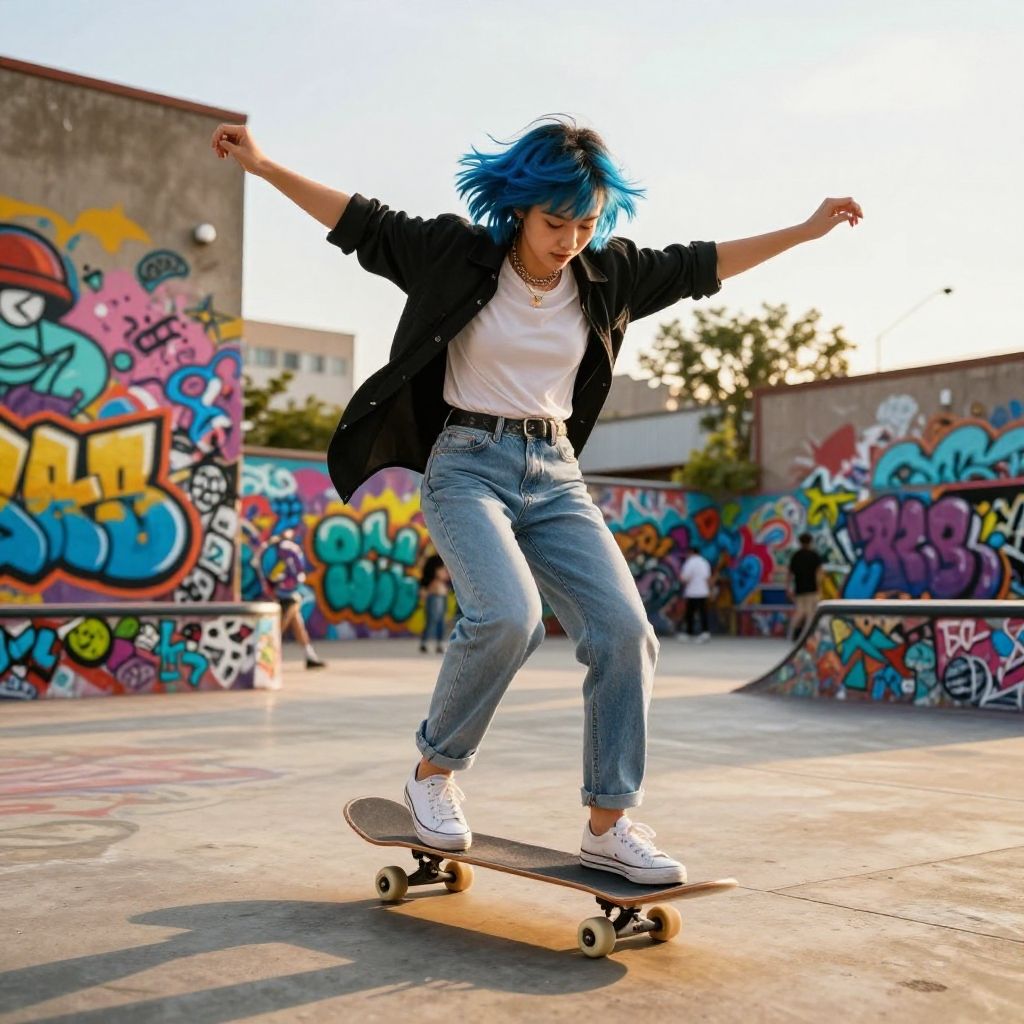 Woman, streetwear, black oversized t-shirt with graphic print, shorts, casual, tattoos on arms and legs, short hair, on skateboard, urban graffiti background.