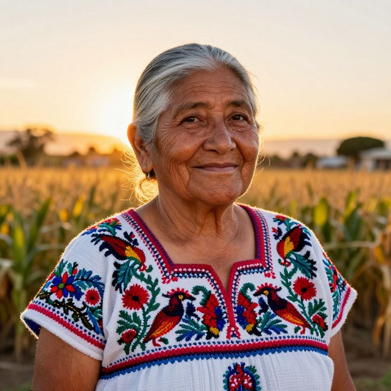 A high-resolution image of a grandmother in her 70s with silver hair tied in a neat bun, kind eyes, and a warm smile, wearing a traditional Mexican huipil shirt with hand-dyed woven patterns of birds and plants, set in a rural village in Oaxaca, Mexico, under a golden sunset with cornfields in the distance.