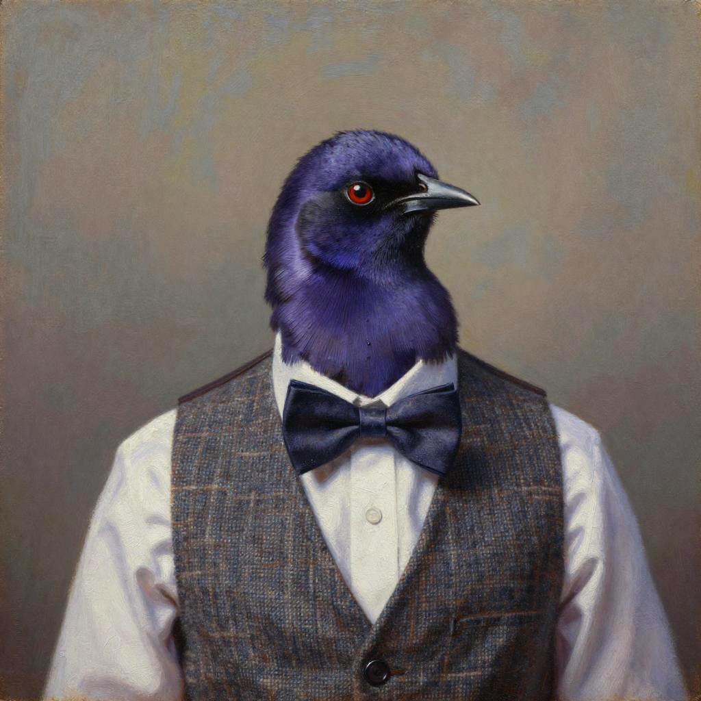 Head and shoulders portrait of a violet-backed starling wearing a tailored tweed vest and bow tie, looking off-camera. Captured in Fujicolor Pro 160NS analog film style with a vintage feel and an oil-on-canvas texture.
