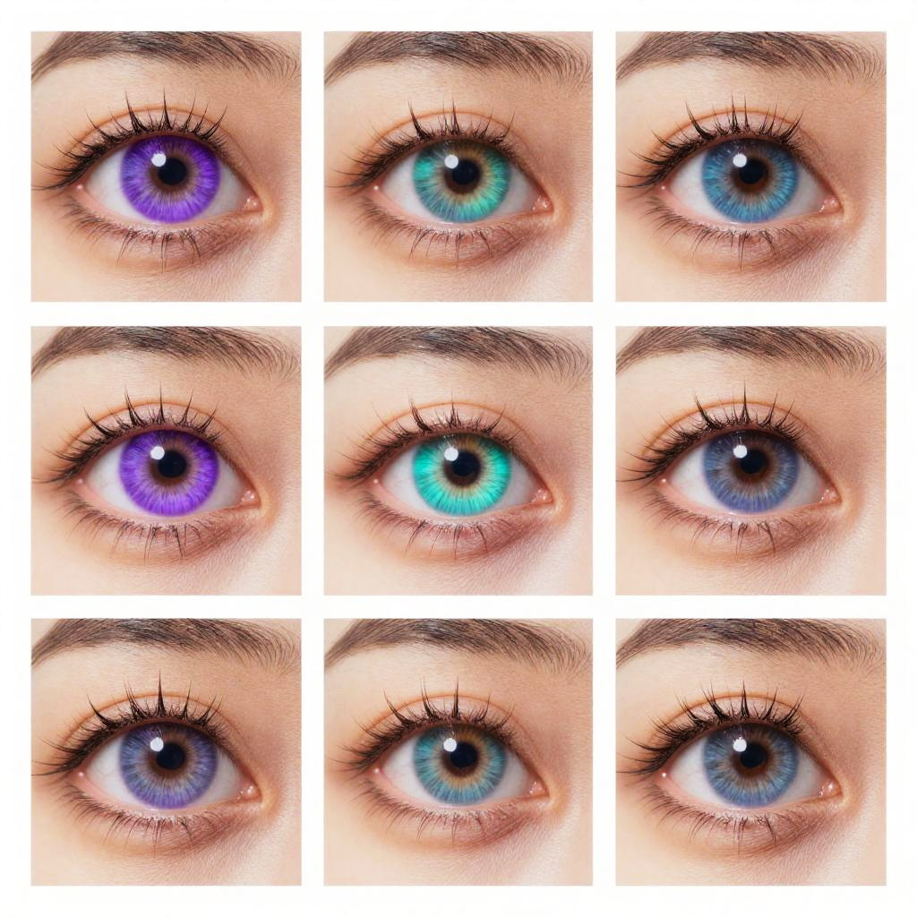 Photo eye color changer showcasing a series of portraits with shifting eye hues from violet to turquoise, dynamic composition, bright studio lighting, ultra detailed iris patterns, contemporary fine art photography style