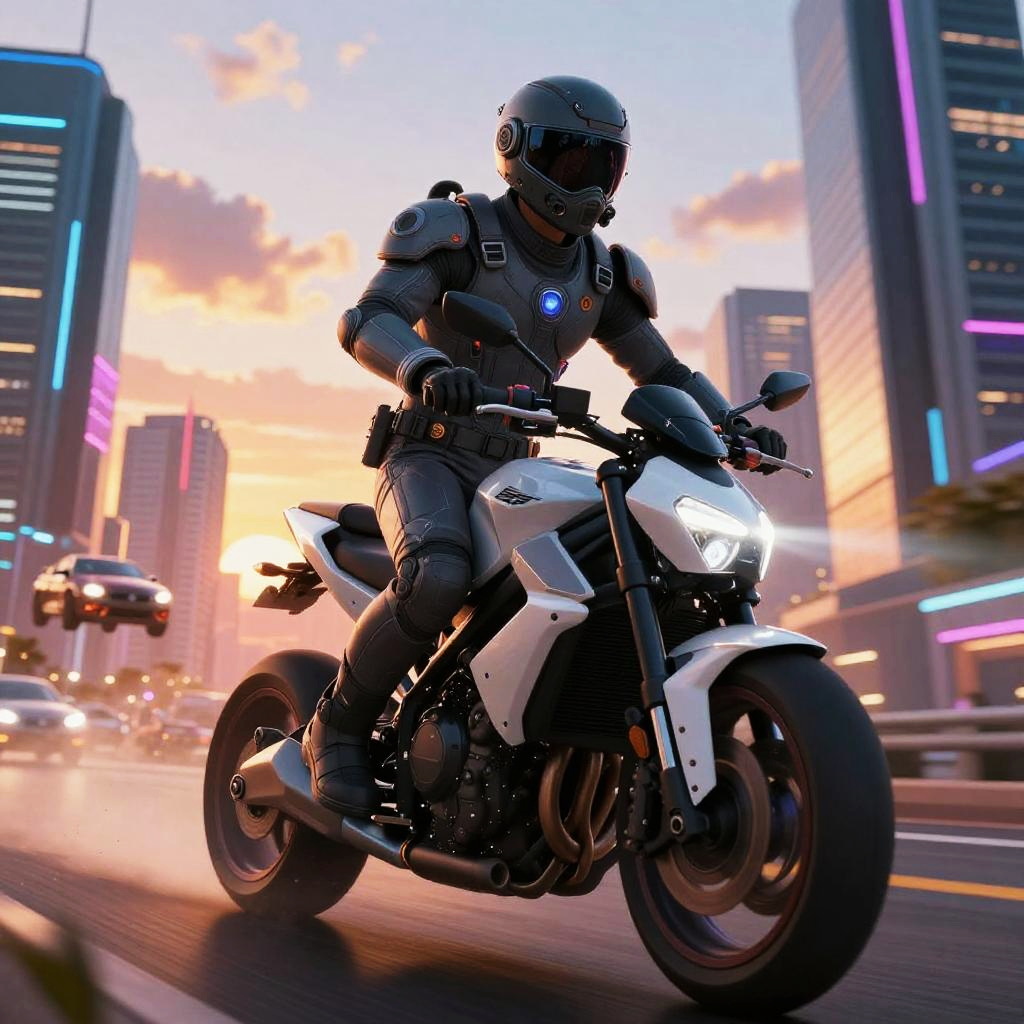 AI anime man with a futuristic pilot suit and visor, poised confidently on a sleek hoverbike, racing through a hyper-modern metropolis filled with towering skyscrapers, neon lights, and flying cars against a vibrant sunset sky.
