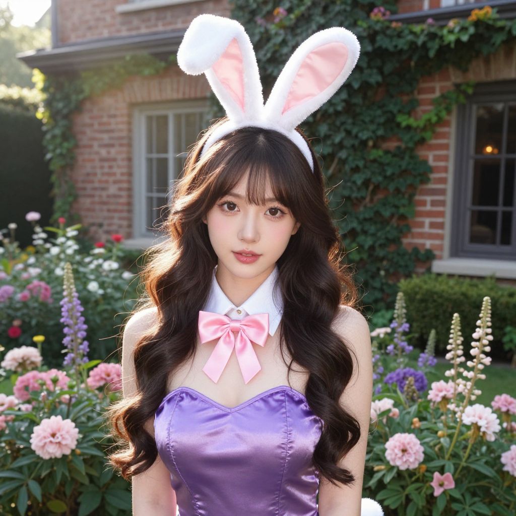 Photograph of an attractive young Asian woman with long, wavy dark brown hair and fair skin. She's wearing a purple satin bunny costume with white bunny ears, a pink bow tie, and a white collar. She's standing in a sunlit garden filled with blooming pink and purple flowers, with a brick house covered in ivy in the background. The lighting creates a warm, magical vibe.