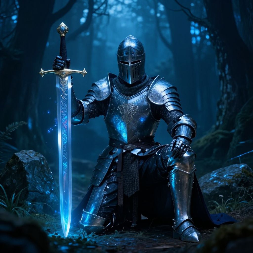 Badass knight kneeling beside a mystical ancient sword embedded in stone, armor reflecting ethereal blue light, surrounding enchanted forest, magical realism style