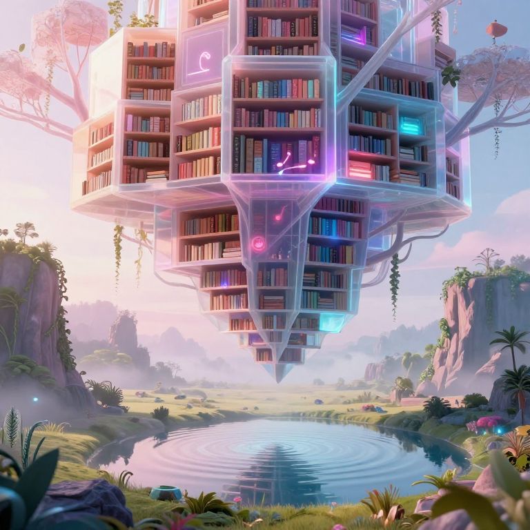A surreal digital artwork portrays an enchanting floating library composed of translucent geometric forms hovering above a dreamlike terrain. The library's intricate design mirrors the branching patterns of tree limbs, with each level holding vast bookshelves featuring titles that softly pulse in sync with ambient music. Below, the landscape transitions from misty fields and ethereal forests to rugged cliffs overgrown with glowing vines. At its center lies a tranquil pond reflecting the floating library, its surface gently undulating as if caressed by invisible fingers. The color scheme predominantly consists of soothing pastel tones that evoke serenity, gradually transitioning into vibrant electric shades that spark curiosity about the mysterious worlds concealed within these celestial volumes.