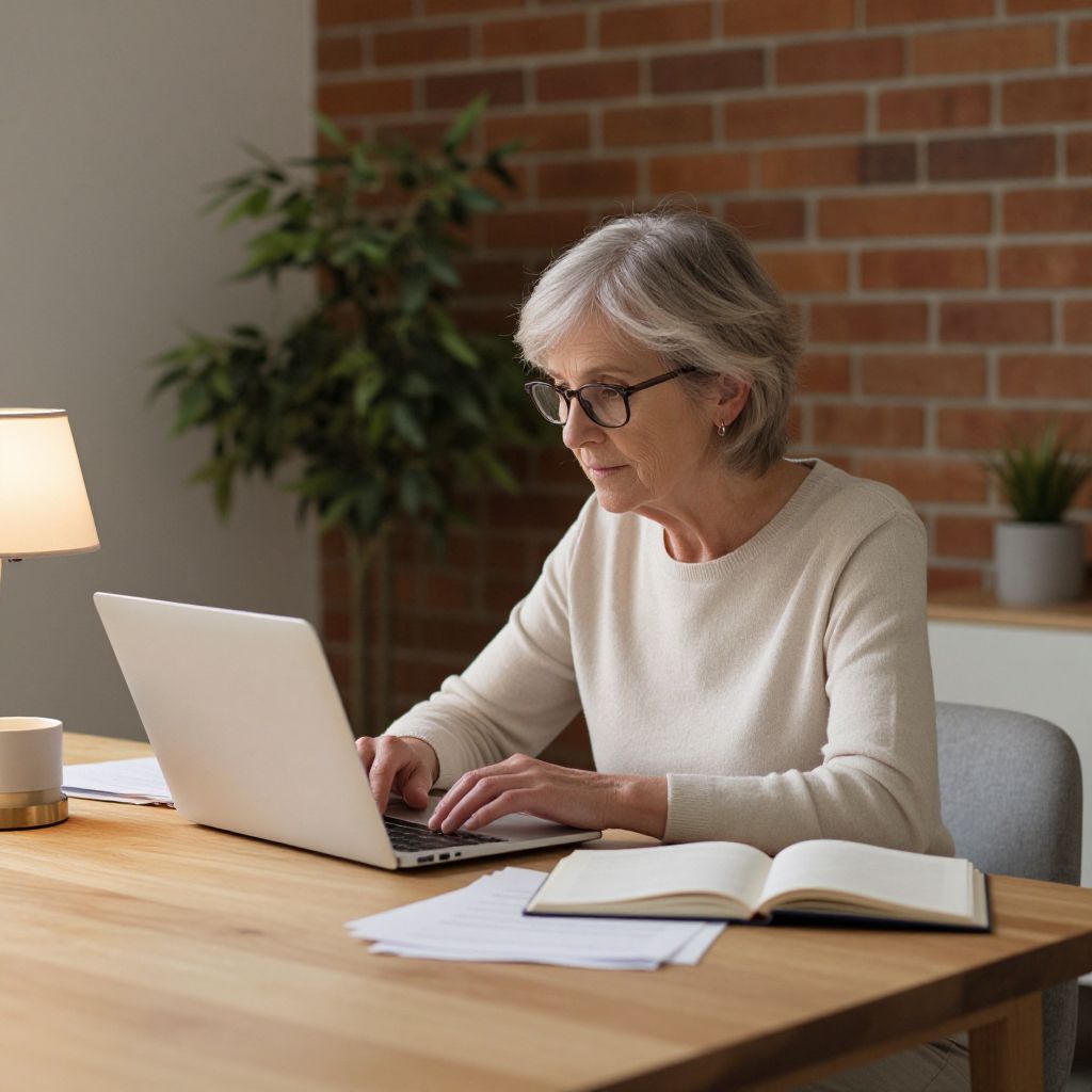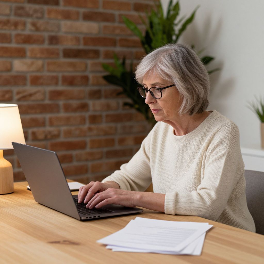 Senior woman engaged in digital activity, comfortably seated at a wooden table with a laptop, papers, and a lamp nearby, surrounded by a cozy indoor setting featuring a brick wall and a green plant in the background.