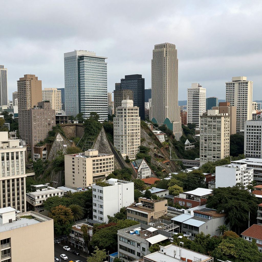 Photograph of a cityscape featuring a mix of modern high-rise buildings and older, triangular-roofed structures, set against a cloudy sky. Urban
