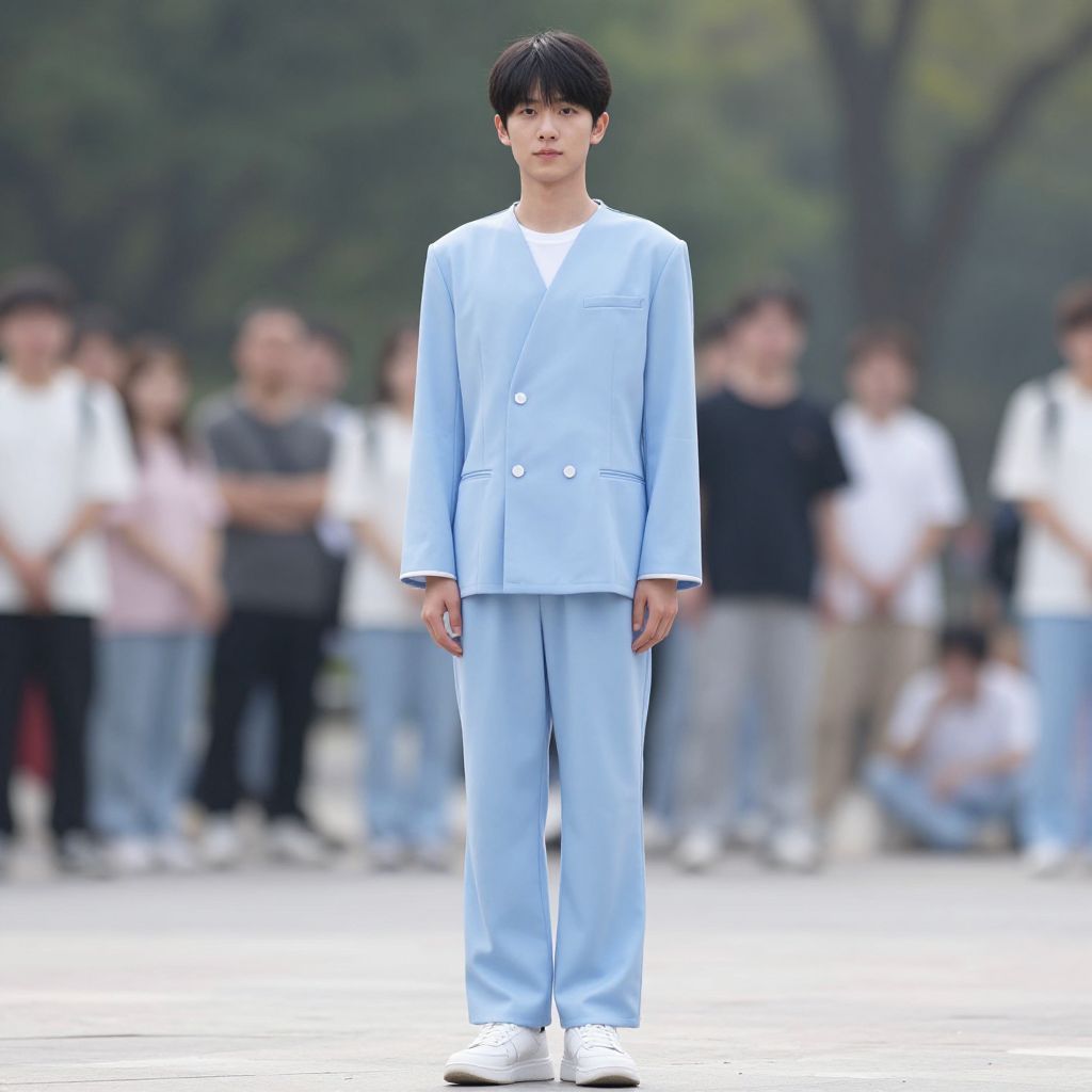 Periwinkle costume, solo, 1boy, male focus, black hair, looking at viewer, full body, standing, blurry, blurry background, day
