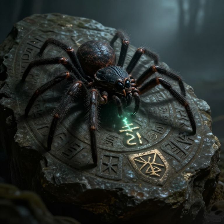 Spider paws gripping ancient runes on a weathered stone surface, mystical symbols glowing faintly, dark fantasy theme, atmospheric lighting with mist and shadows, highly detailed illustration
