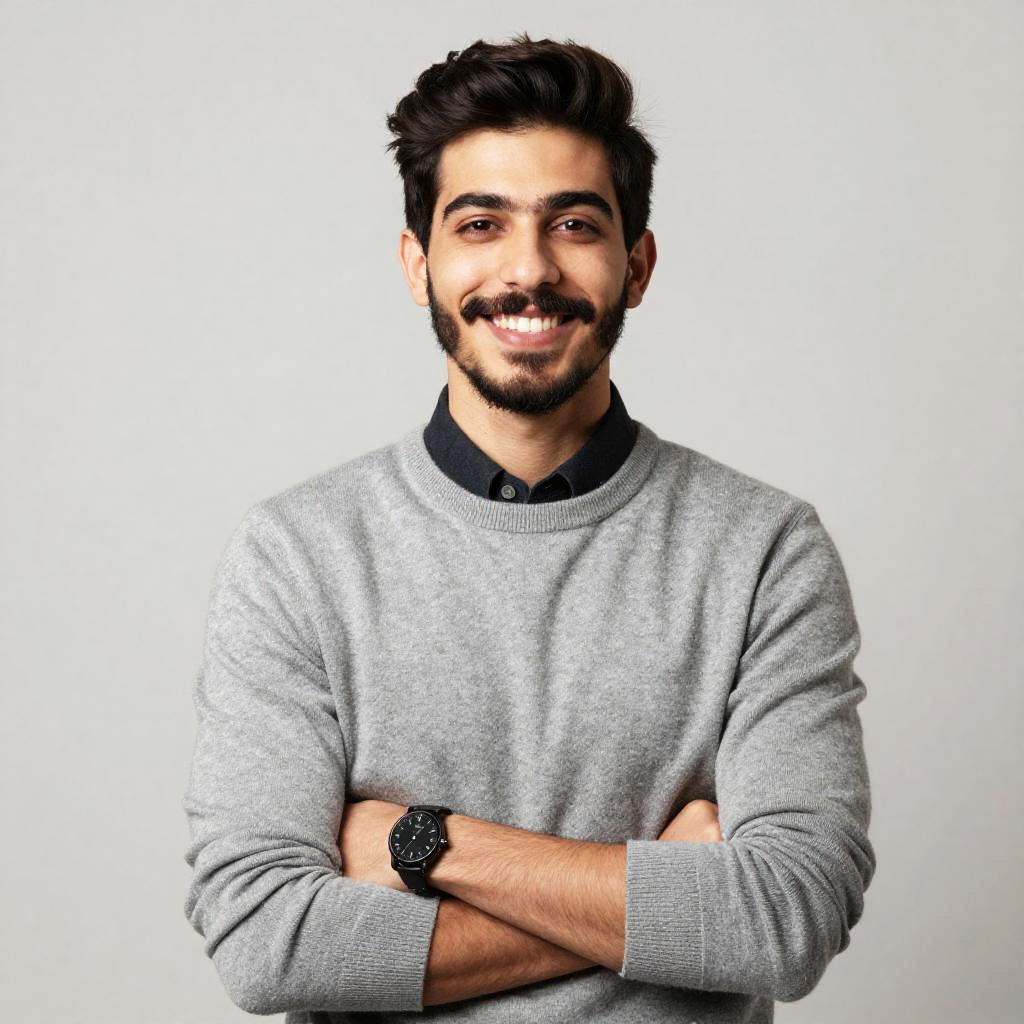 A confident young man with dark hair and a neatly trimmed mustache and beard smiles warmly at the camera. He is dressed casually in a gray sweater over a dark collared shirt and wears a black watch, posed against a plain light gray background in a studio setting.