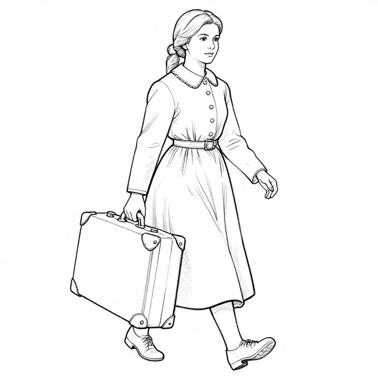 Portrait Painting coloring page black and white of a girl walking with a suitcase in Finnmark in 1945,